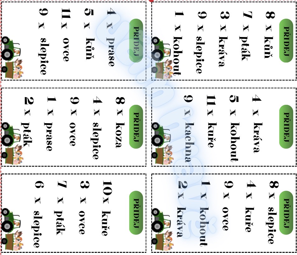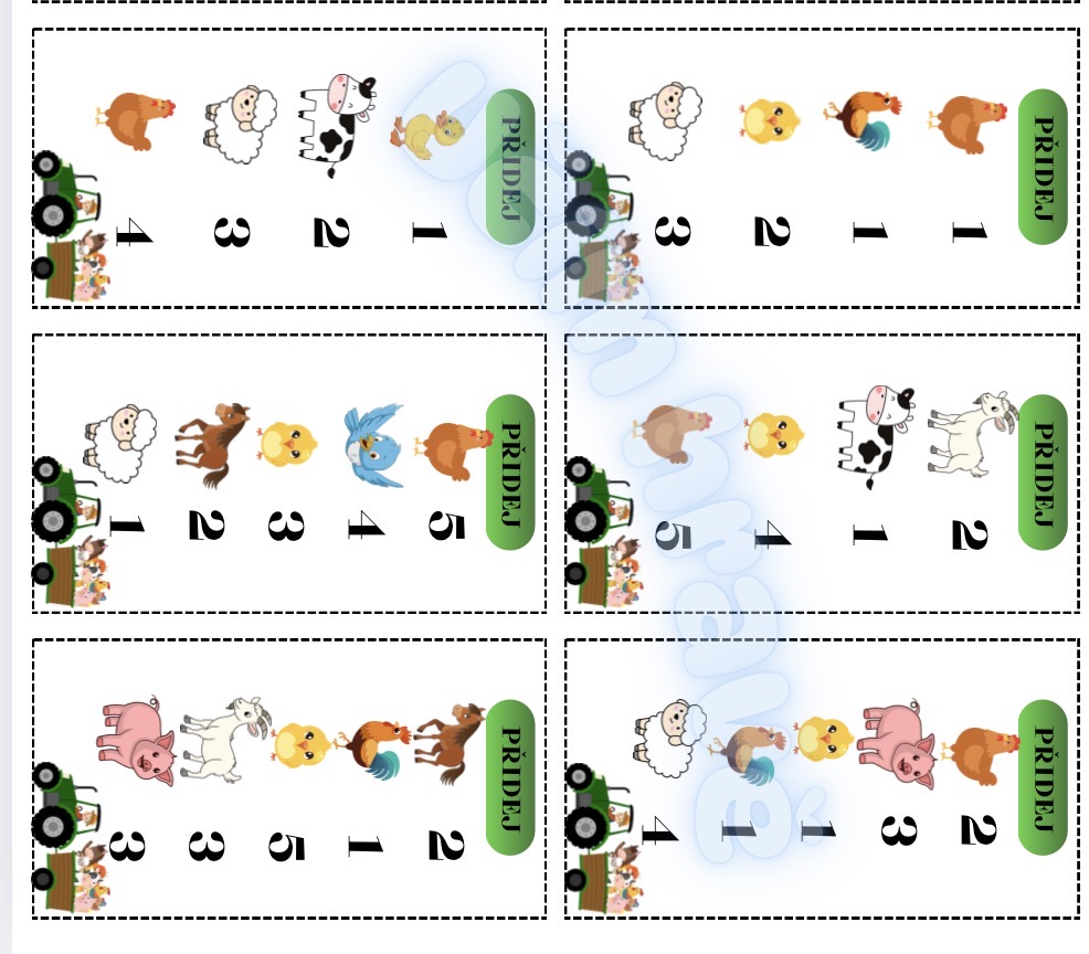- Obrázky hospodářských zvířat (koza, kůň, kráva, ovce, ptáček, kachna, kuře, slepice, kohout)