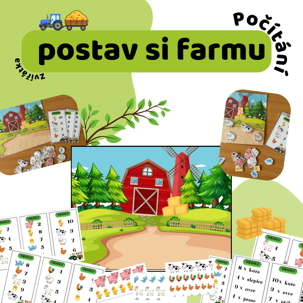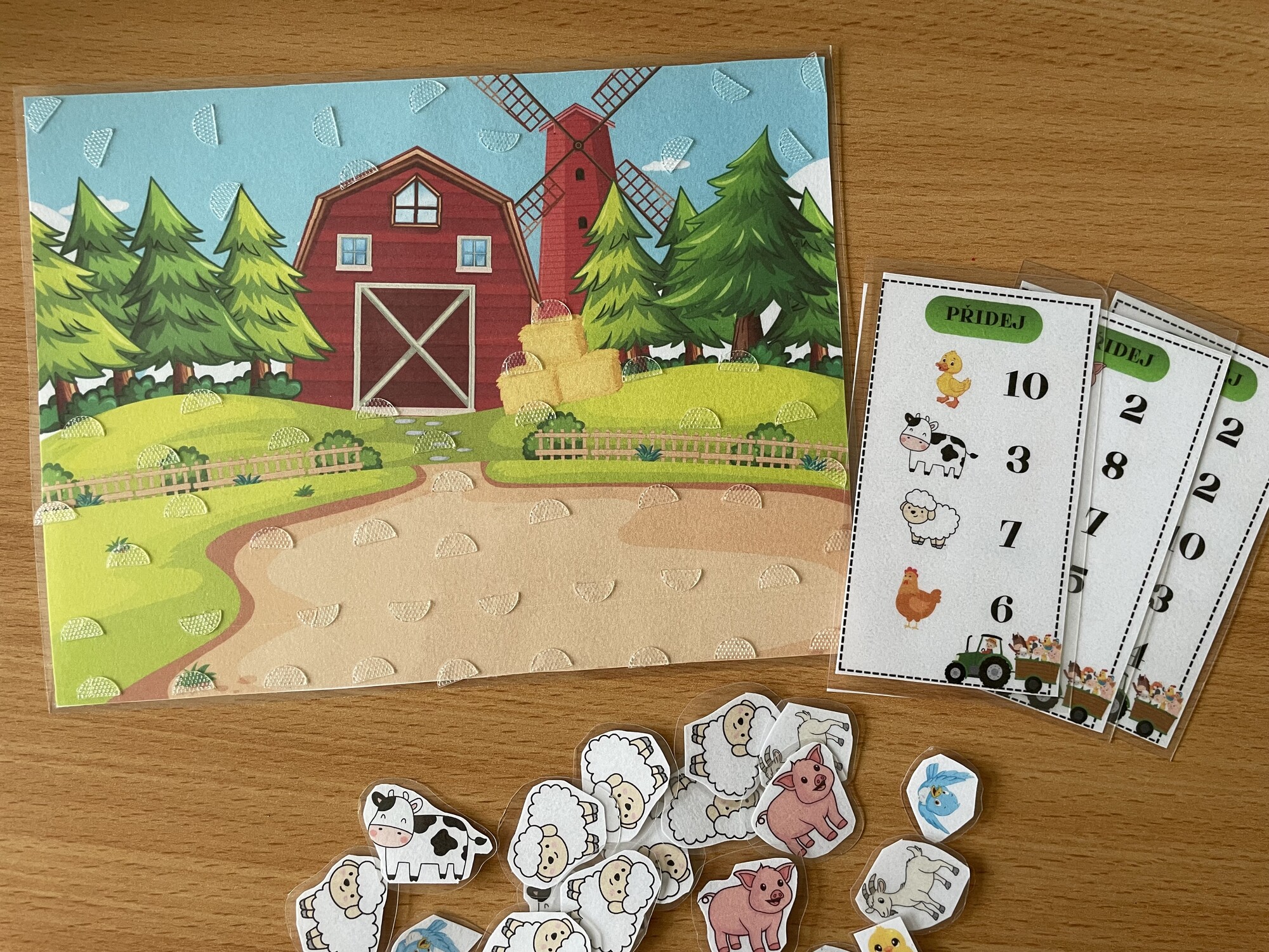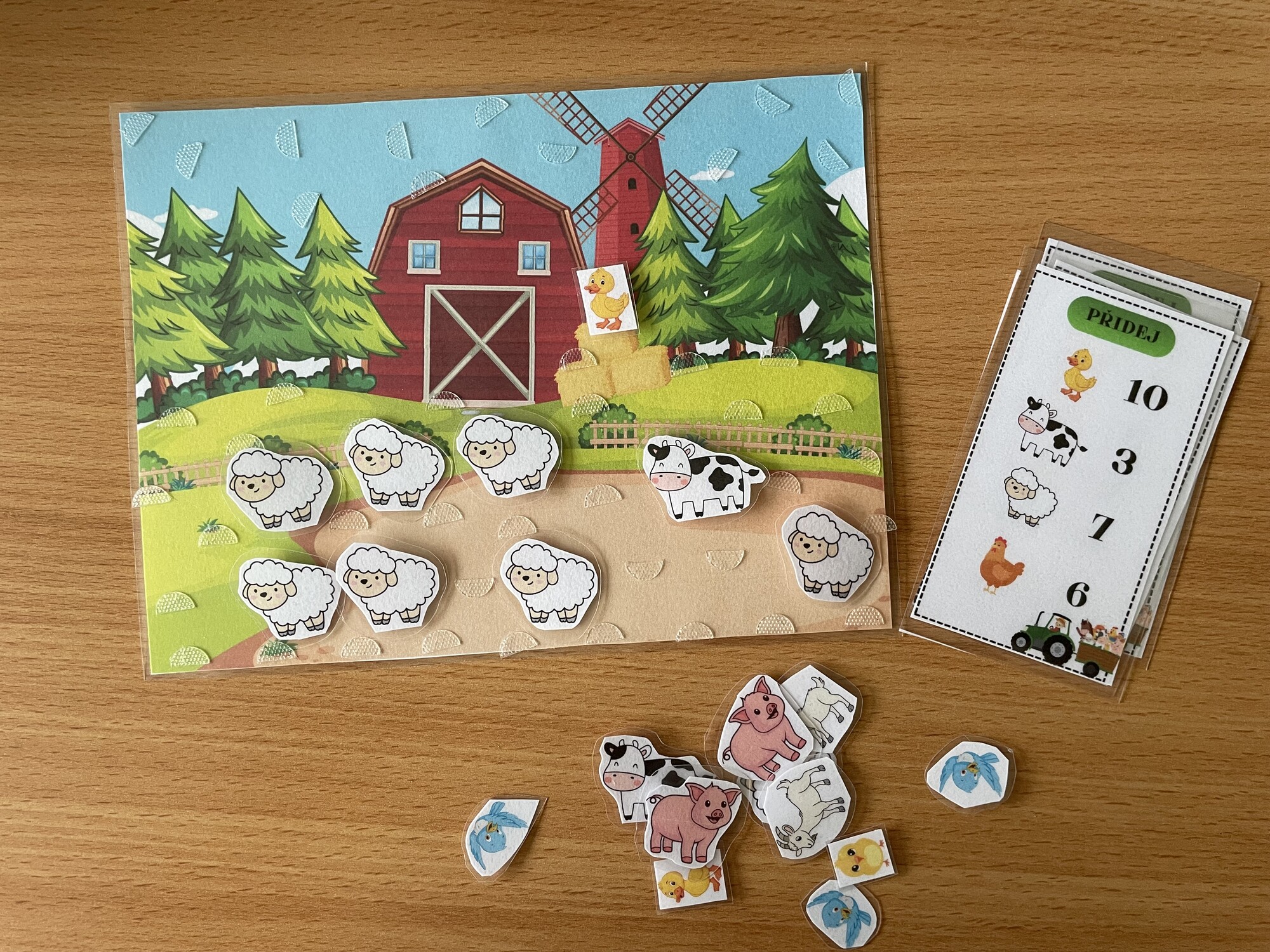 Tento výukový materiál nabízí dětem zábavnou manipulativní aktivitu, ve které vytvářejí vlastní farmu podle zadaných úkolů. Pomocí kartiček se zvířaty děti počítají, třídí a plní jednoduché instrukce. Materiál rozvíjí počítání do 10, porozumění pokynům, jemnou motoriku i slovní zásobu na téma hospodářská zvířata.