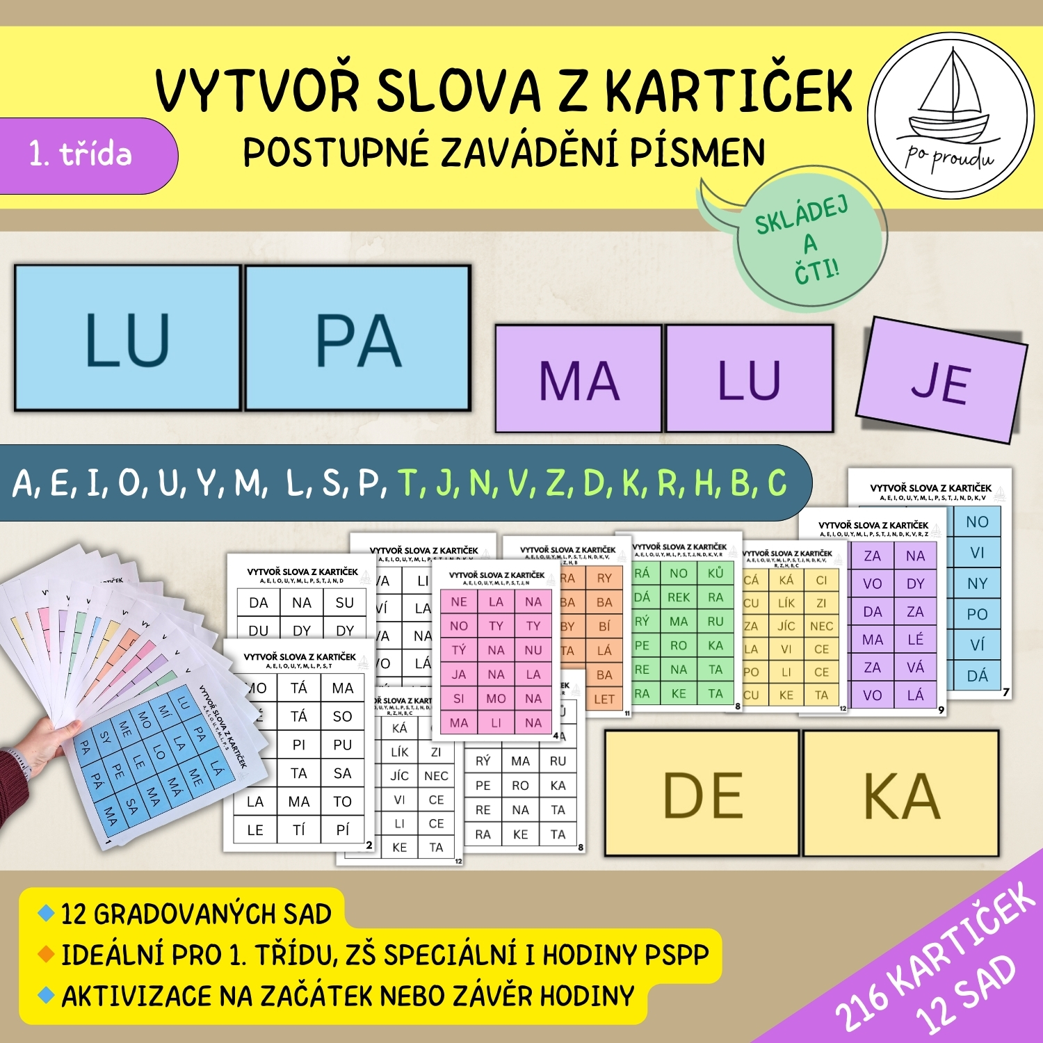 Děti skládají slova ze slabik ve 12 různých sadách. Díky tomu si upevňují jistotu ve čtení, přesnost i radost z toho, že dokážou slovo samy správně přečíst a vytvořit.