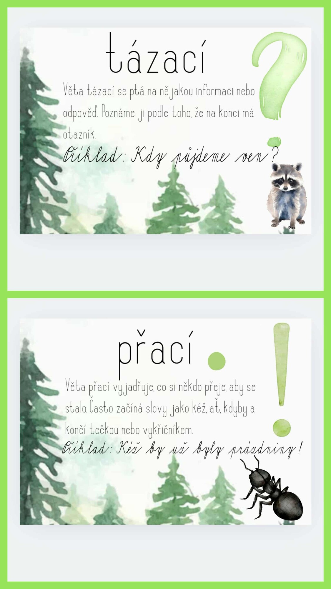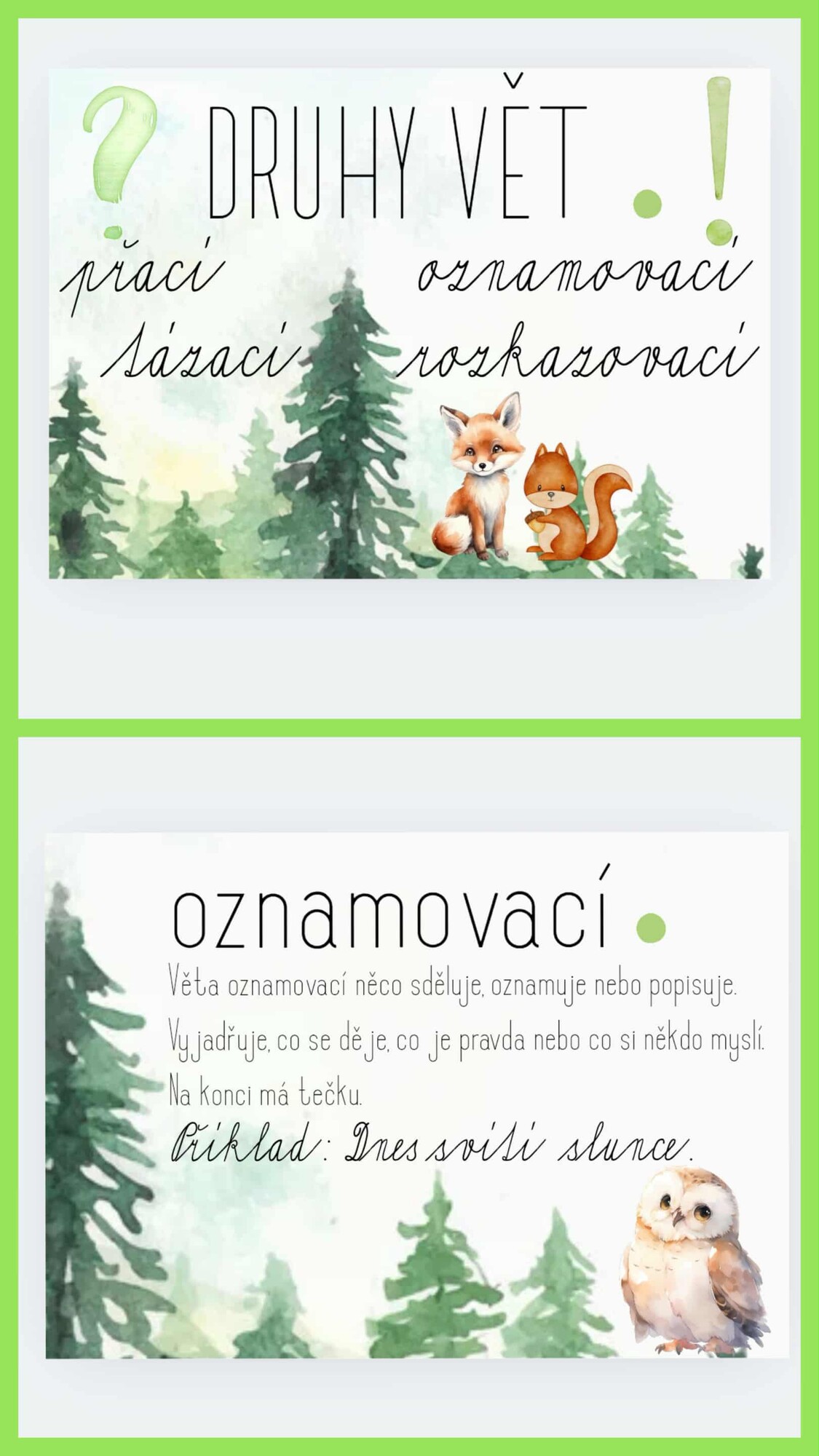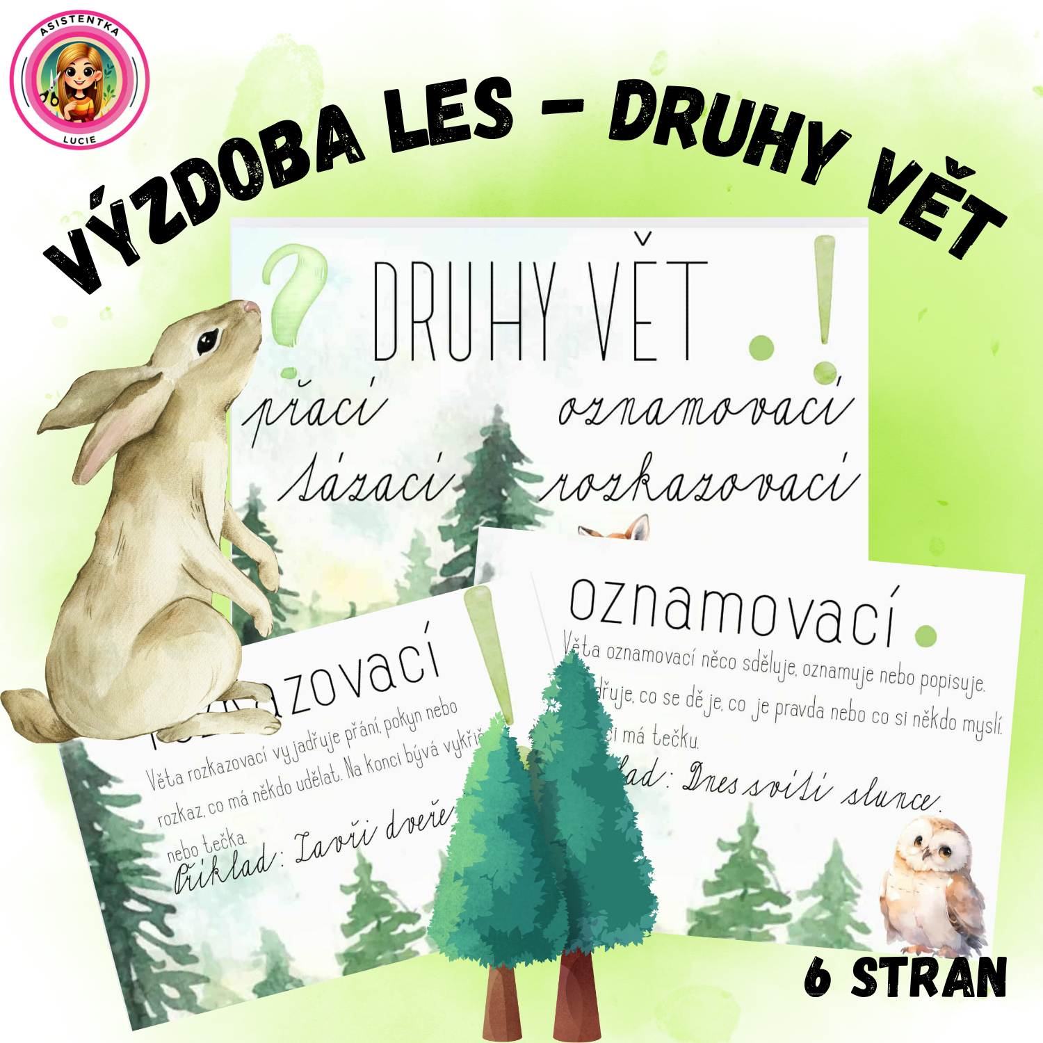 Materiál slouží jako výzdoba třídy s tematikou lesa a druhů vět. Obsahuje přehledné plakáty s názvy, vysvětlením a příklady vět oznamovacích, tázacích, rozkazovacích a přacích.