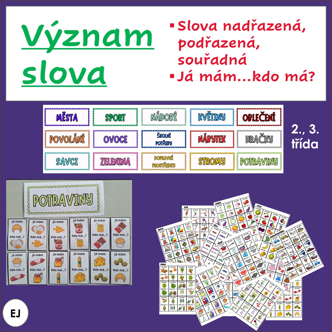 Žáci k jednotlivým nadřazeným slovům tvoří co nejvíce slov podřazených, slovní vyjadřování a popis si procvičí ve hře Já mám, kdo má...?