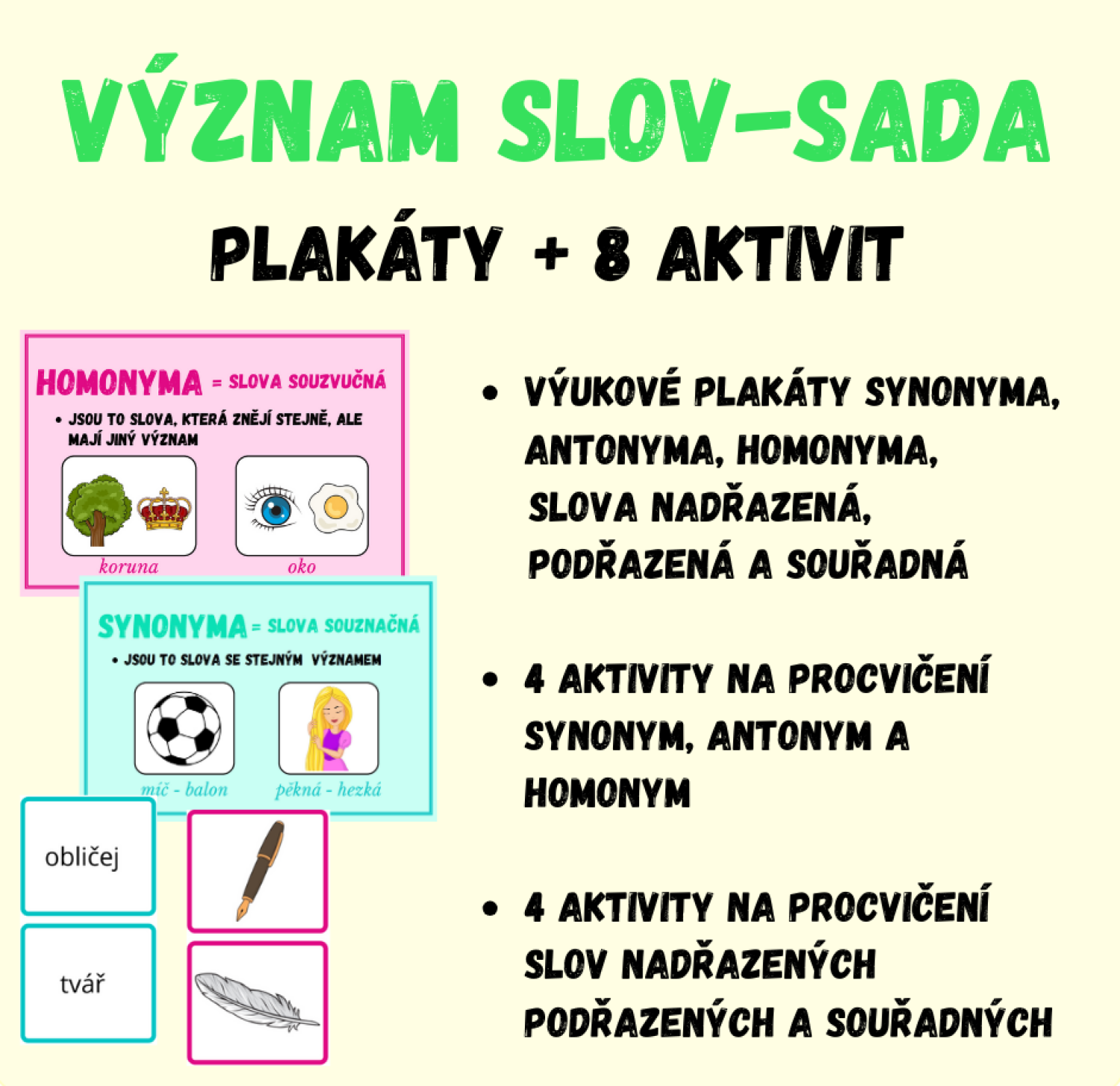 - výukové plakáty na synonyma, homonyma, antonyma, slova nadřazená, podřazená a souřadná