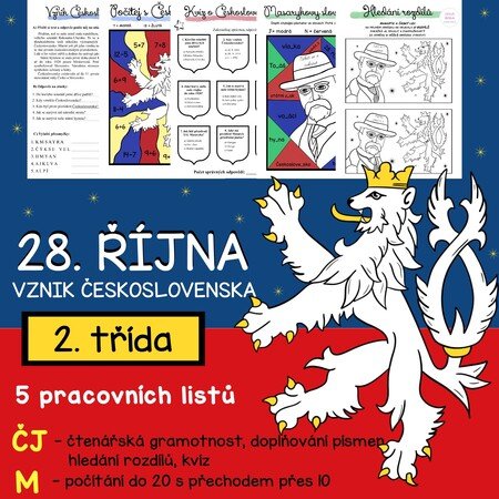 🇨🇿 MATERIÁL obsahuje 5 PL s TÉMATIKOU VZNIKU ČESKOSLOVENSKA 28. ŘÍJNA do ČJ a M pro 2. TŘÍDU
