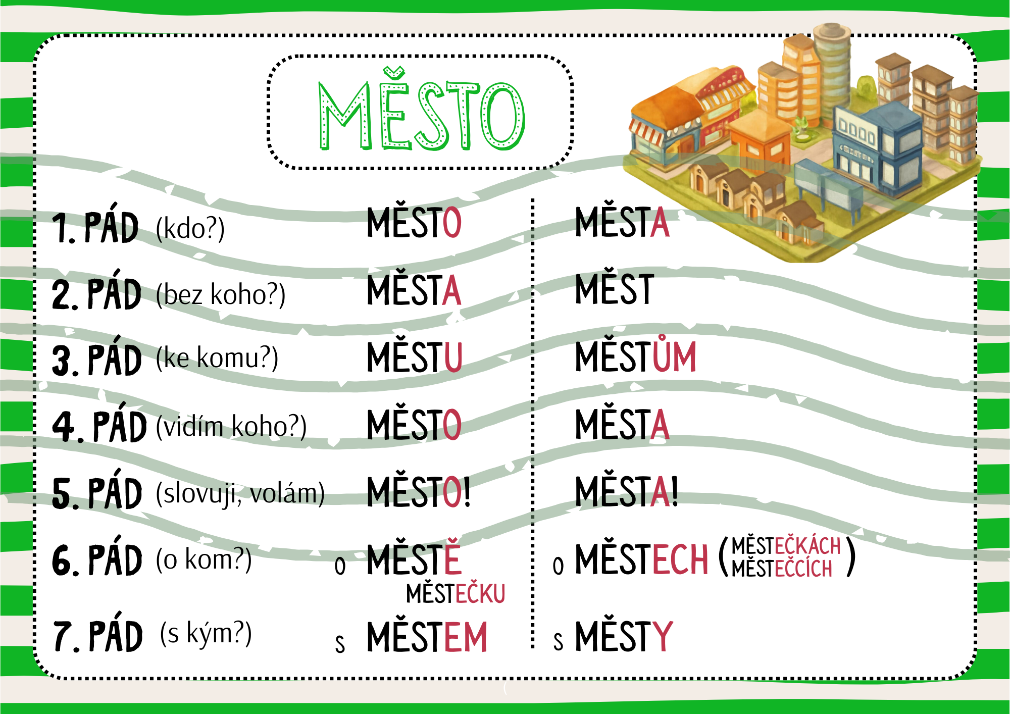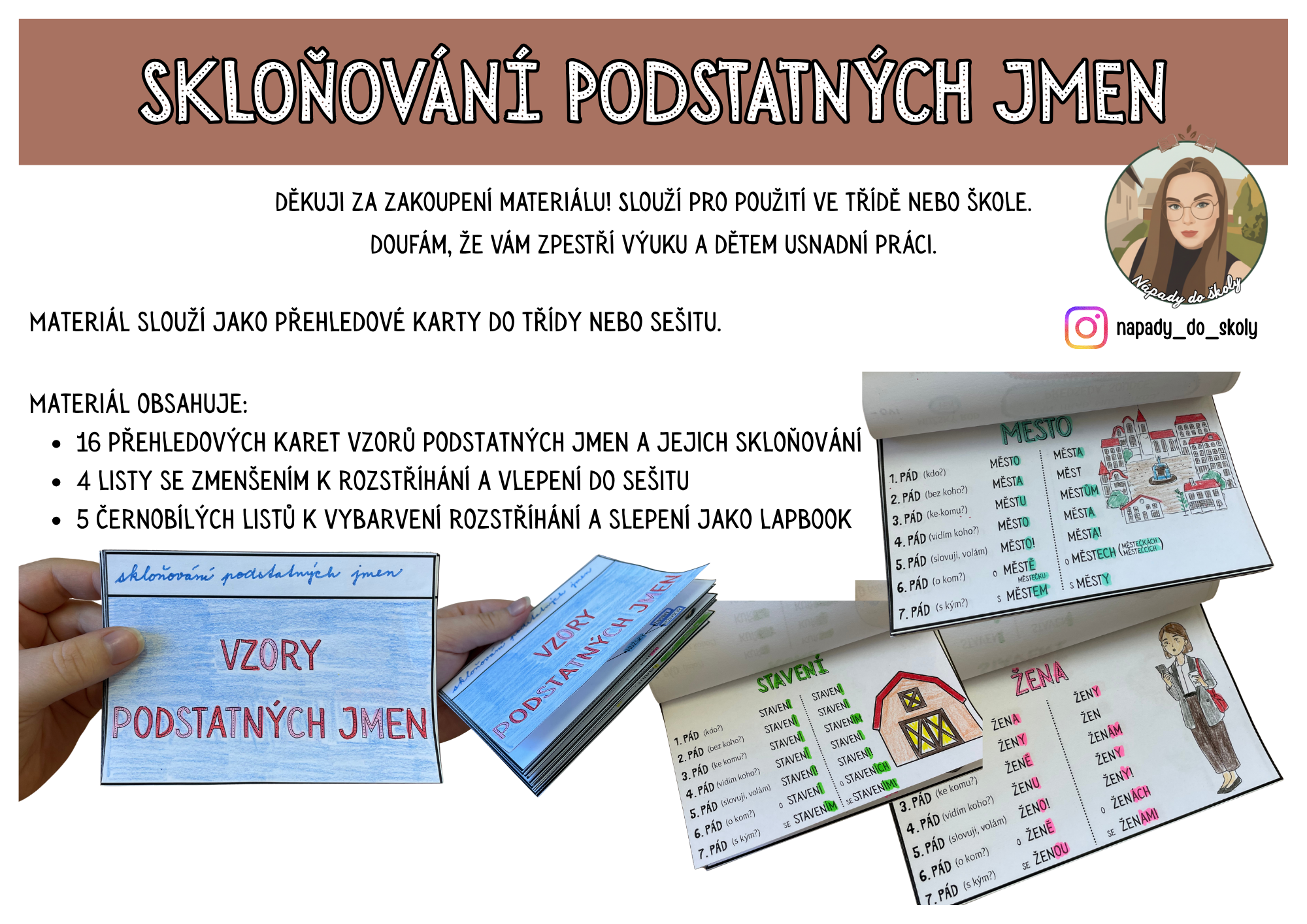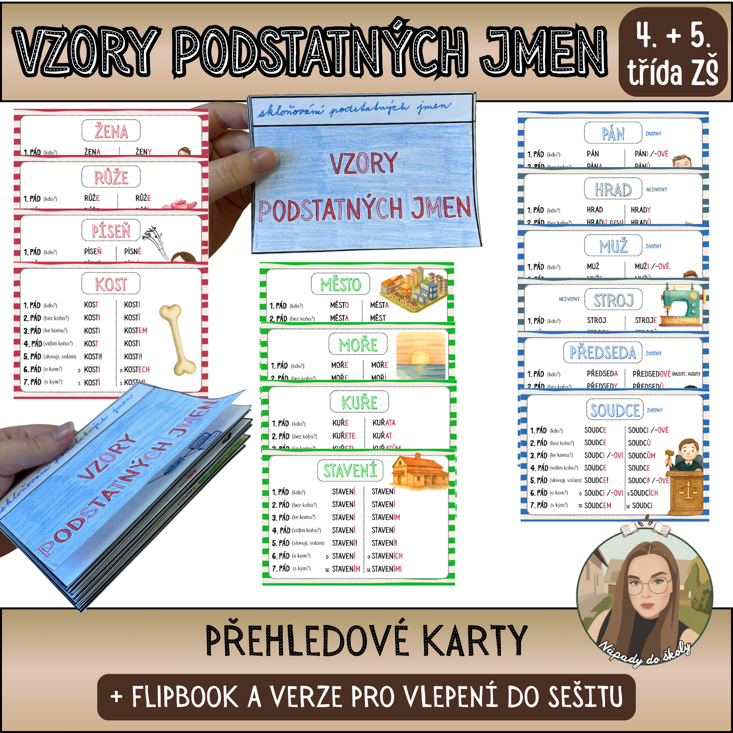 Přehledové karty obsahují všechny vzory podstatných jmen a jejich skloňování ve všech pádech.