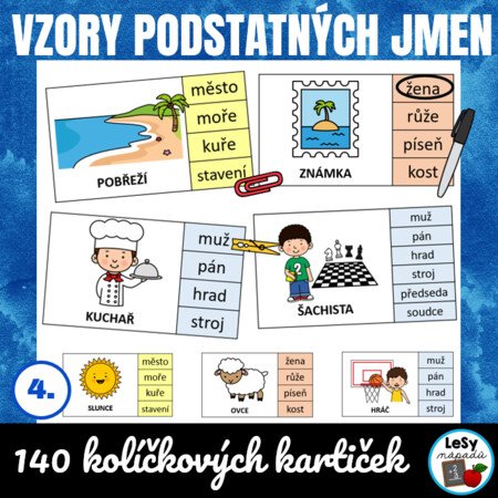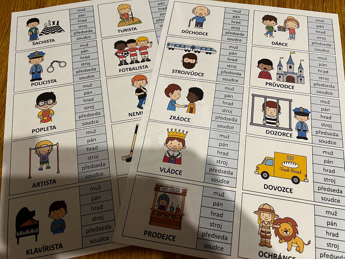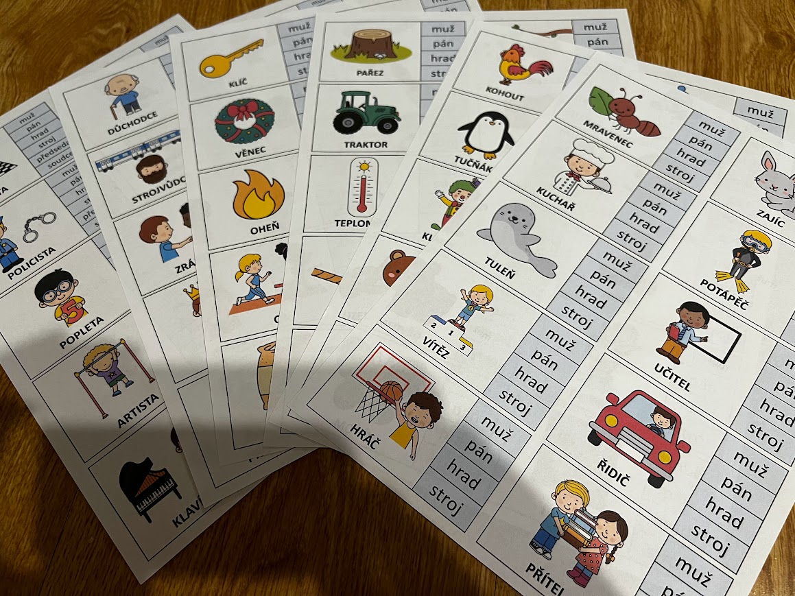 •60 kartiček obsahuje vzory rodu mužského, tj. 6 x 10 kartiček (40 kartiček je pro vzory muž, pán, hrad, stroj a 20 kartiček je pro rozlišování mezi všemi vzory rodu mužského, tj. 6 možností na jedné kartičce: muž, pán, hrad, stroj, předseda a soudce)