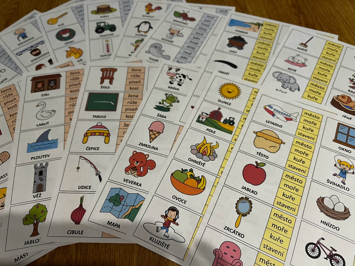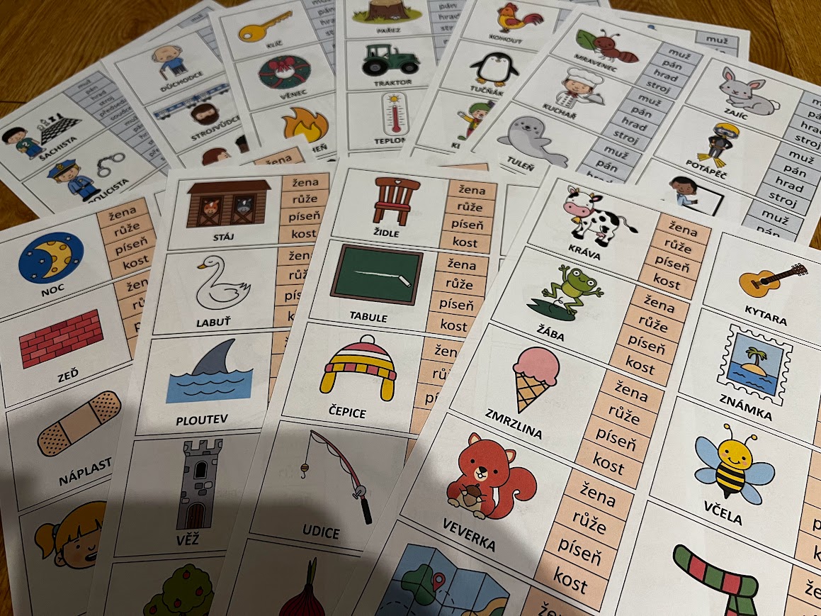 •na jedné straně formátu A4 na výšku je 10 kartiček pro jeden vzor podstatného jména