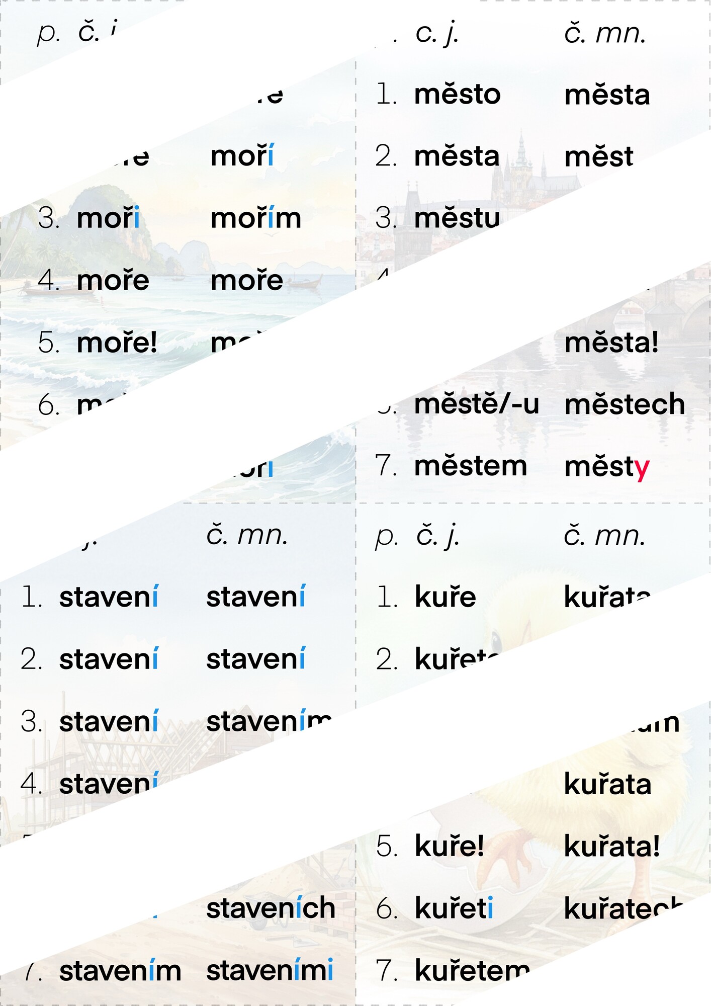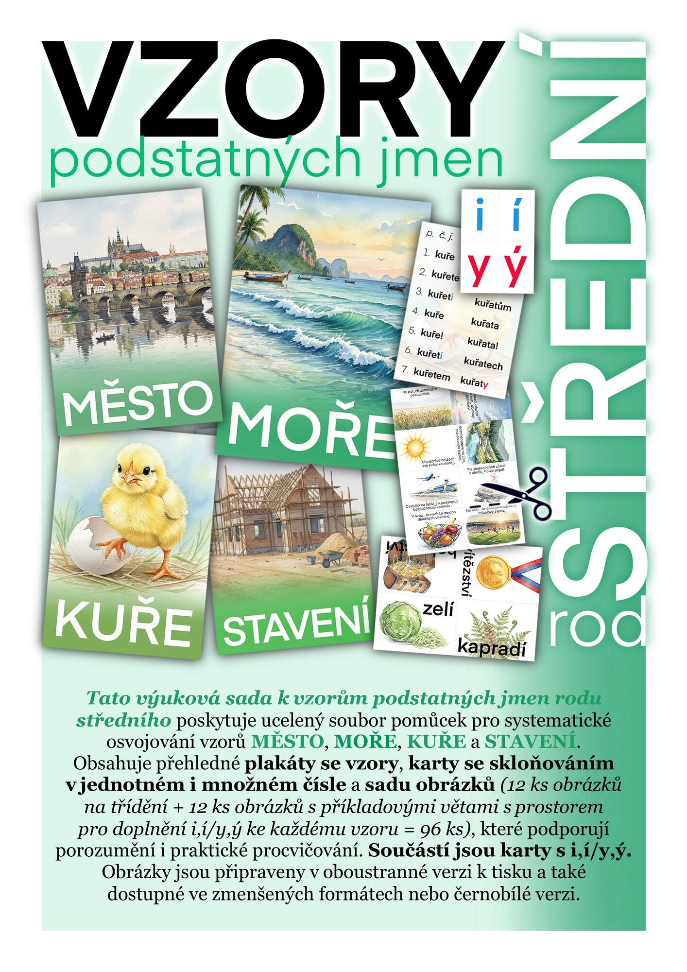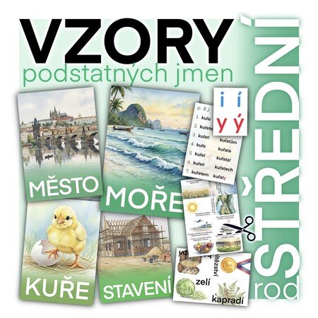 Tato výuková sada k vzorům podstatných jmen rodu středního poskytuje ucelený soubor pomůcek pro systematické osvojování vzorů MĚSTO, MOŘE, KUŘE a STAVENÍ.
