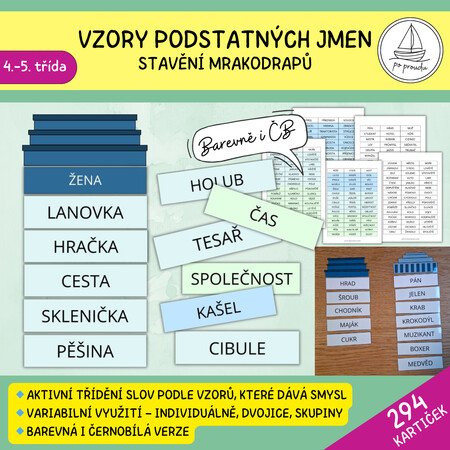 - celkem 558 kartiček k procvičení vzorů podstatných jmen