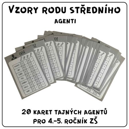 Materiál obsahuje 20 karet k procvičení určování vzorů podstatných jmen rodu středního. Na každé kartě žáci kroužkují písmena u správných vzorů k daným podstatným jménům. Vyjde jim jméno tajného agenta.