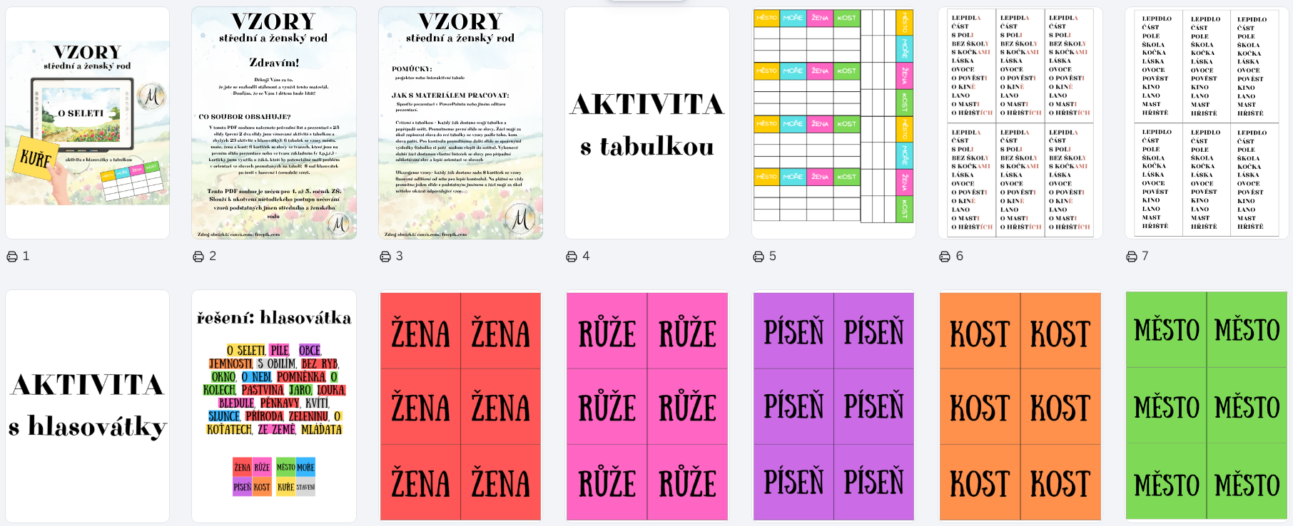 - 6 kartiček se slovy ve tvarech, které jsou na prvním slidu prezentace nebo ve tvaru základním (v 1. p., č.j.) - kartičky jsem využila u žáků, kteří by potenciálně měli problém v orientaci ve slovech promítaných na tabuli