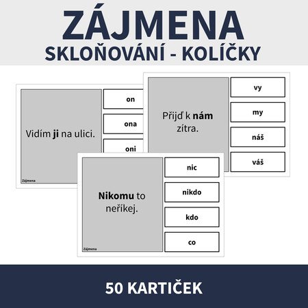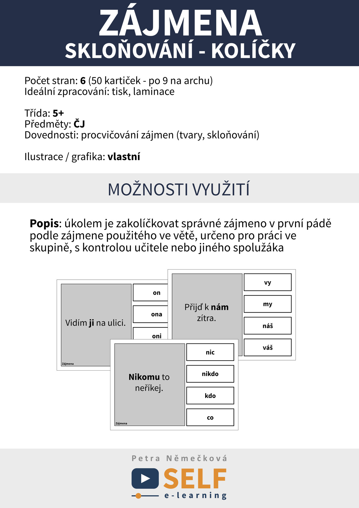 Popis: úkolem je zakolíčkovat správné zájmeno v první pádě podle zájmene použitého ve větě, určeno pro práci ve skupině, s kontrolou učitele nebo jiného spolužáka