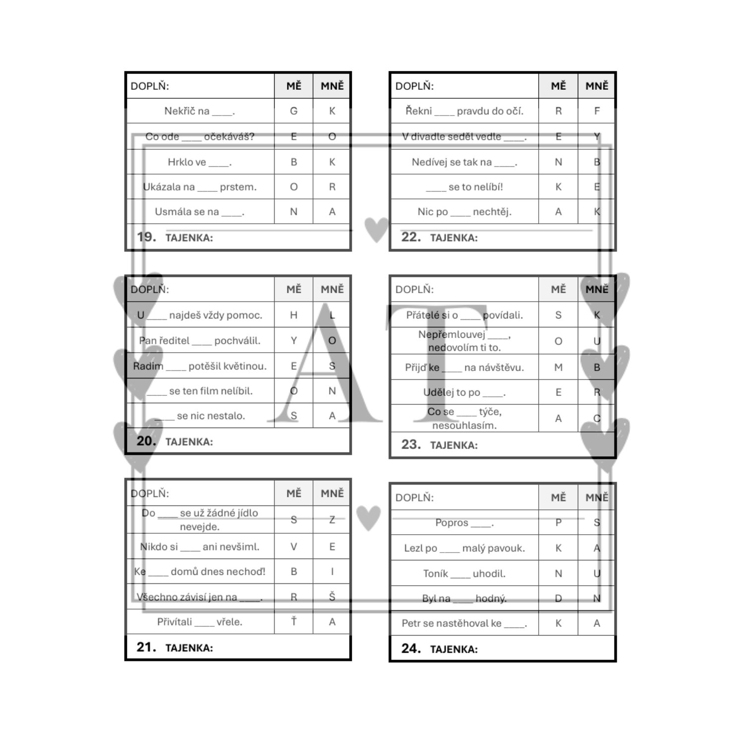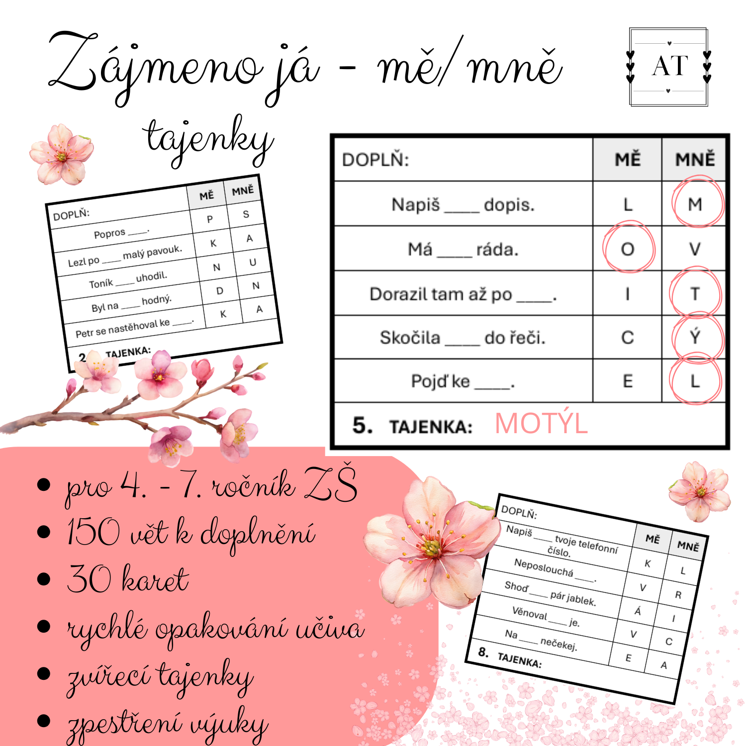 Žáci si hravou formou rychle procvičí doplňování správného tvaru zájmena já do vět. Každá karta obsahuje 5 vět k doplnění. Po doplnění všech vět a zakroužkování písmen v nabídce vyjde žákům zvířecí tajenka. Kterou si zapíší dospodu karty.