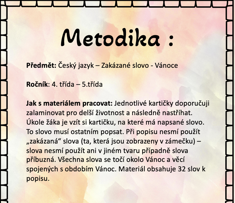 32 kartiček na popis slov. Všechna slova souvisí s Vánocemi a obdobím kolem Vánoc.