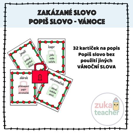 Úkolem dětí je popsat výraz, který je nahoře. K popisu ale nesmí použít slova, která jsou pod zámkem (tabu slova) Nesmí použít ani jiný tvar slova nebo slova příbuzná.