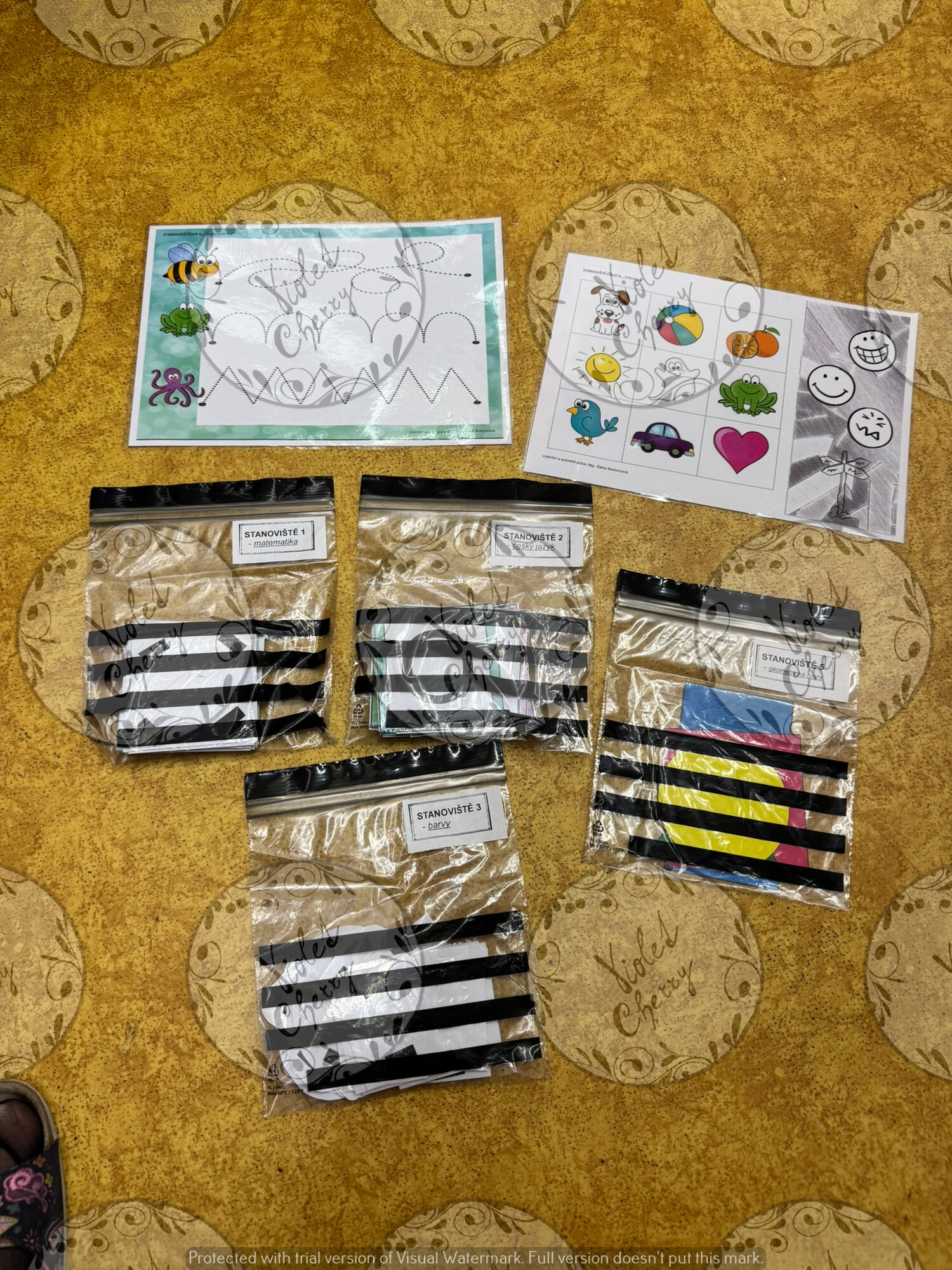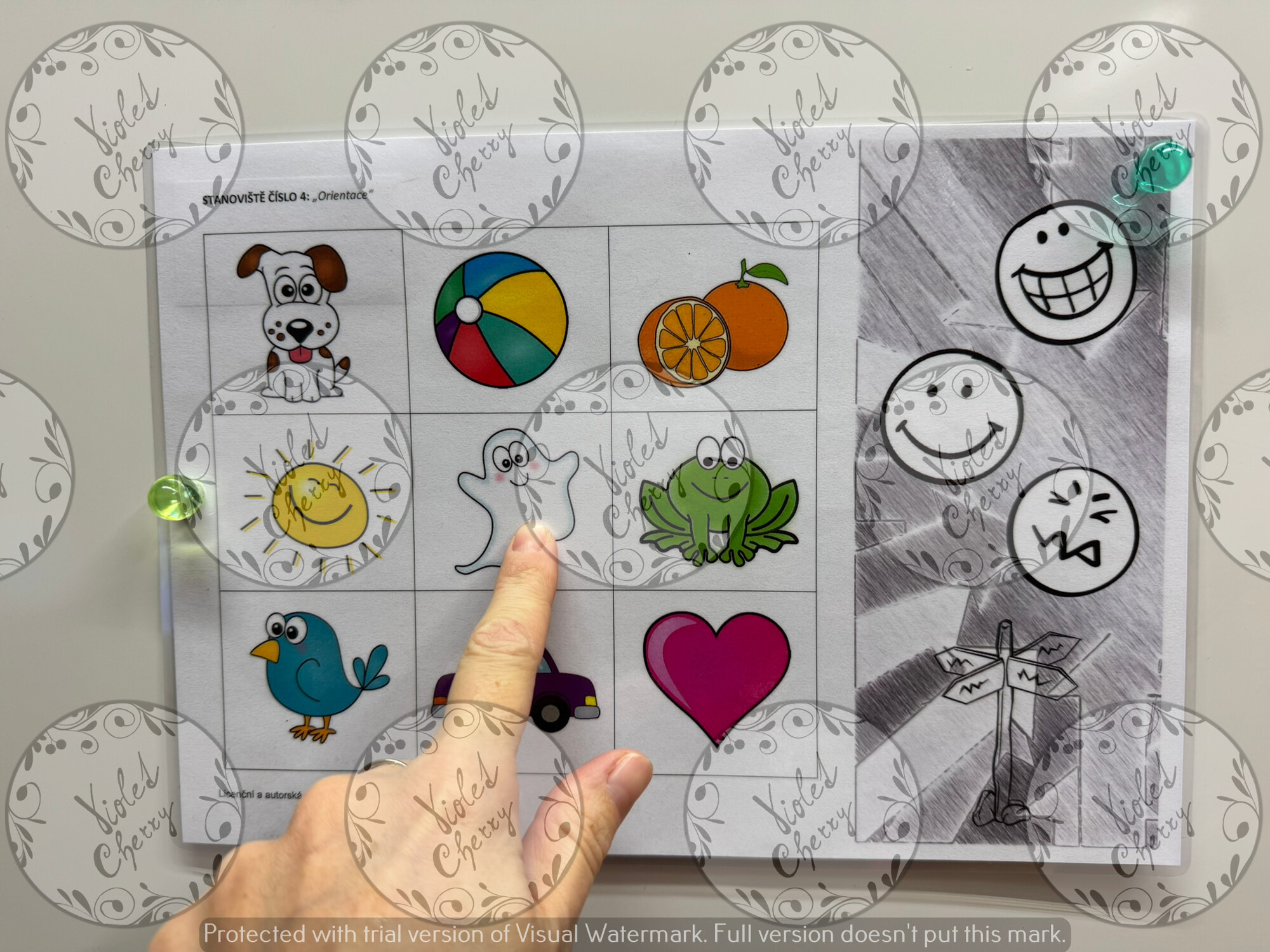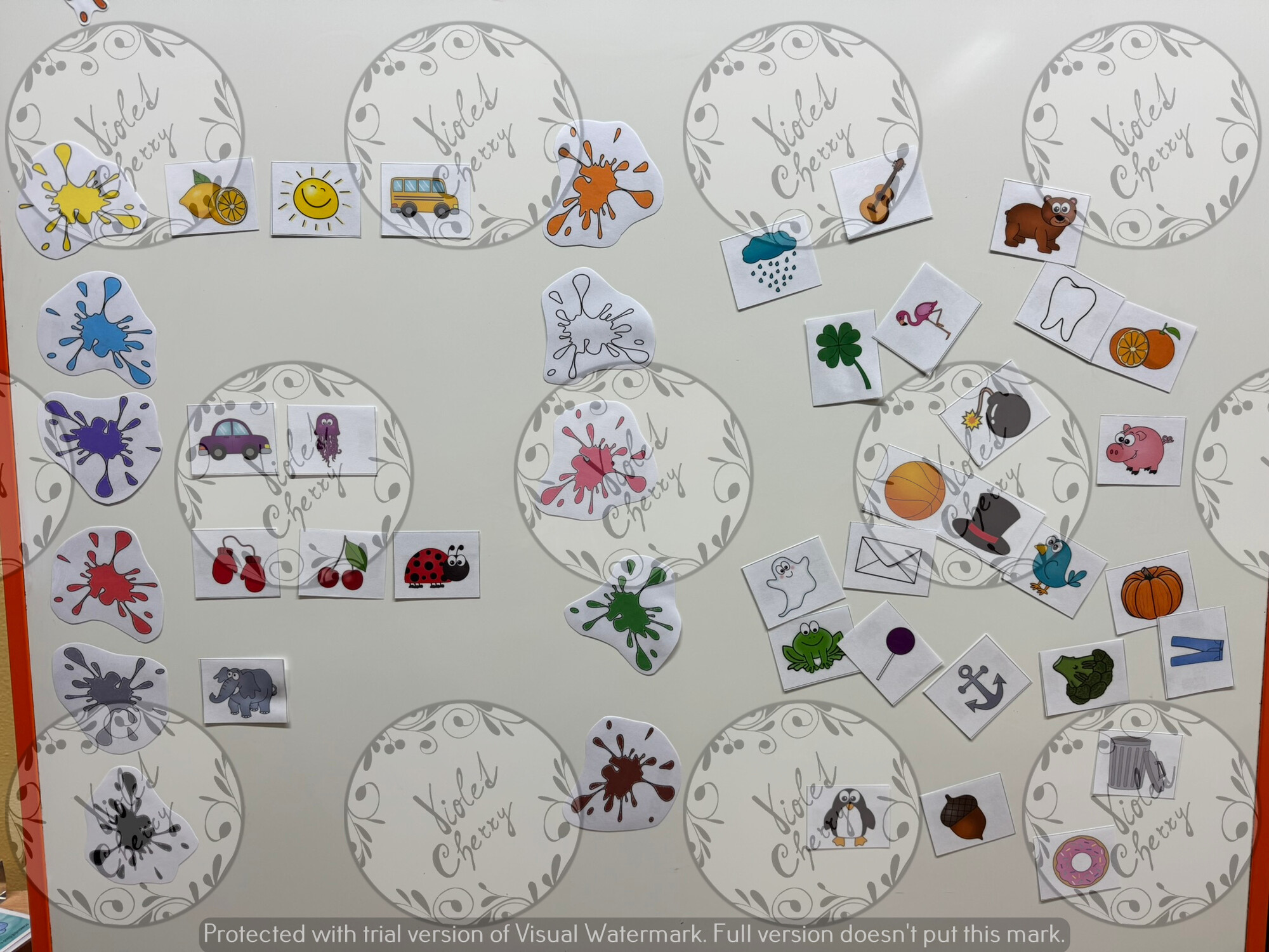 cílem je barvy nejprve pojmenovat (barvené skvrny), poté se ke skvrnám přiřazují jednotlivé obrázky podle barvy (vždy 3 obrázky k jedné barvě).