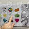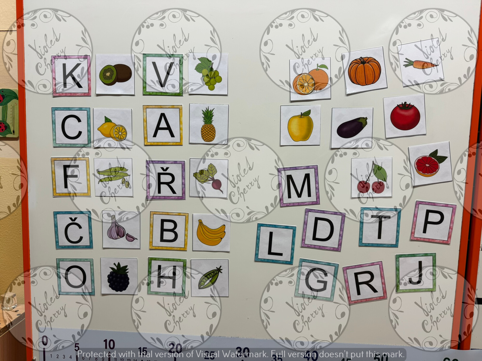 k nim poté děti přiřazují jednotlivé obrázky ovoce a zeleniny podle počátečního písmene (J jako jablko),