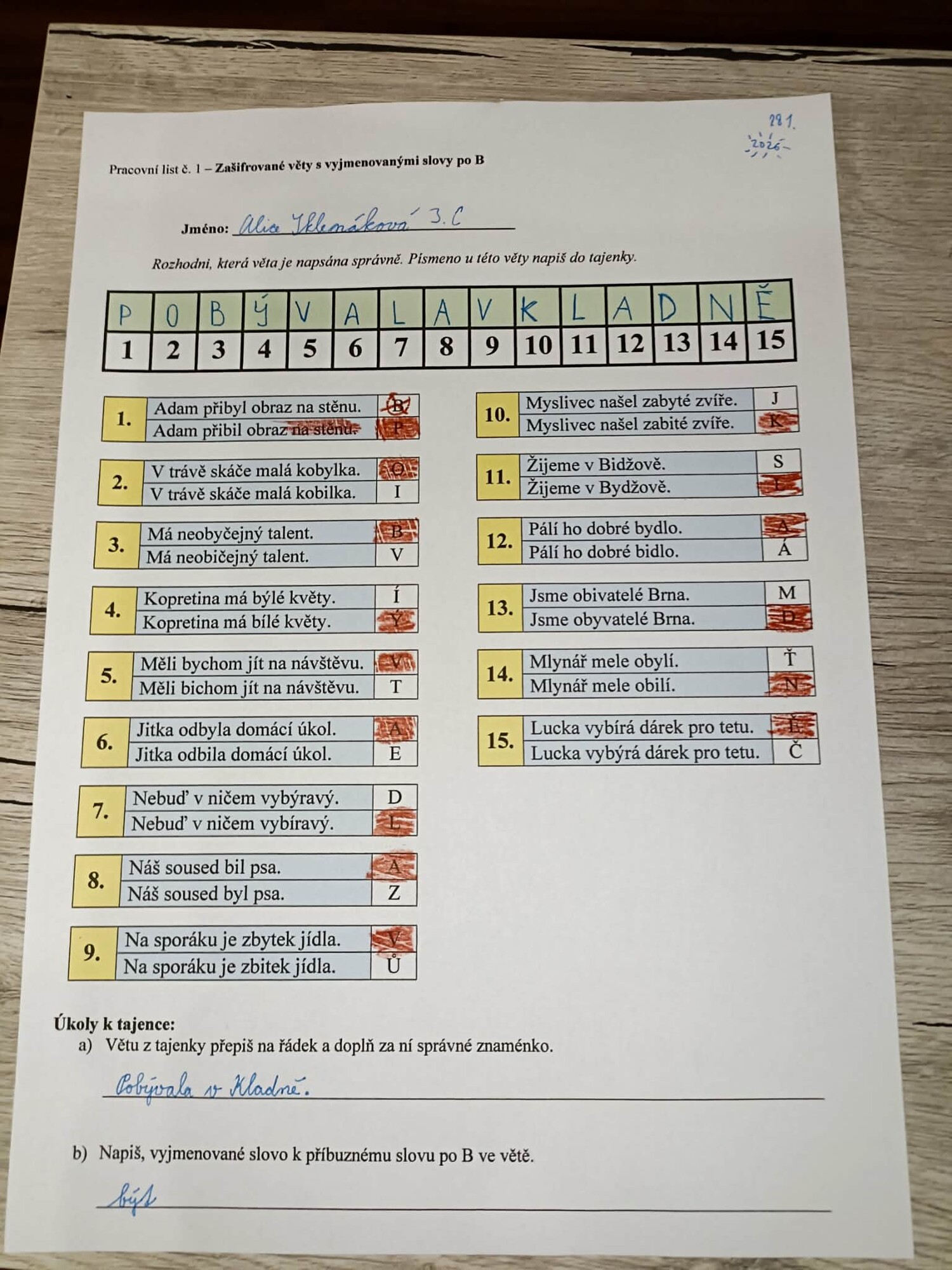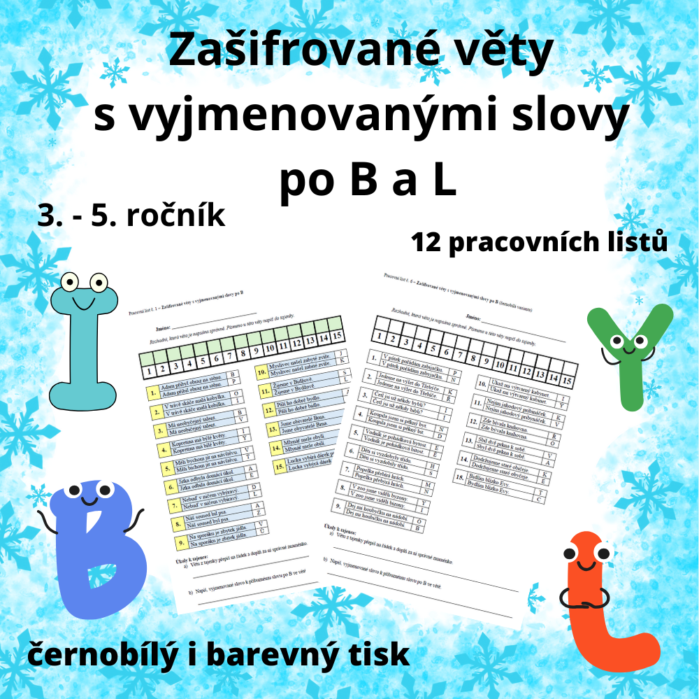 Materiál je určen k procvičování pravopisu po vyjmenovaných slovech po B a L. Děti čtou věty a rozhodují o jejich správnosti. Jakmile najdou správnou větu zapíší písmenko, které je za ní uvedeno do tajenky. Pokud budou postupovat správně vyjde jim smysluplná tajenka.