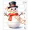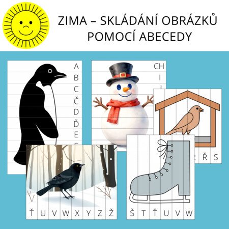 Materiál obsahuje skládačky pěti zimních obrázků (tučňák, sněhulák, pták v krmítku, brusle, pták v zimě).