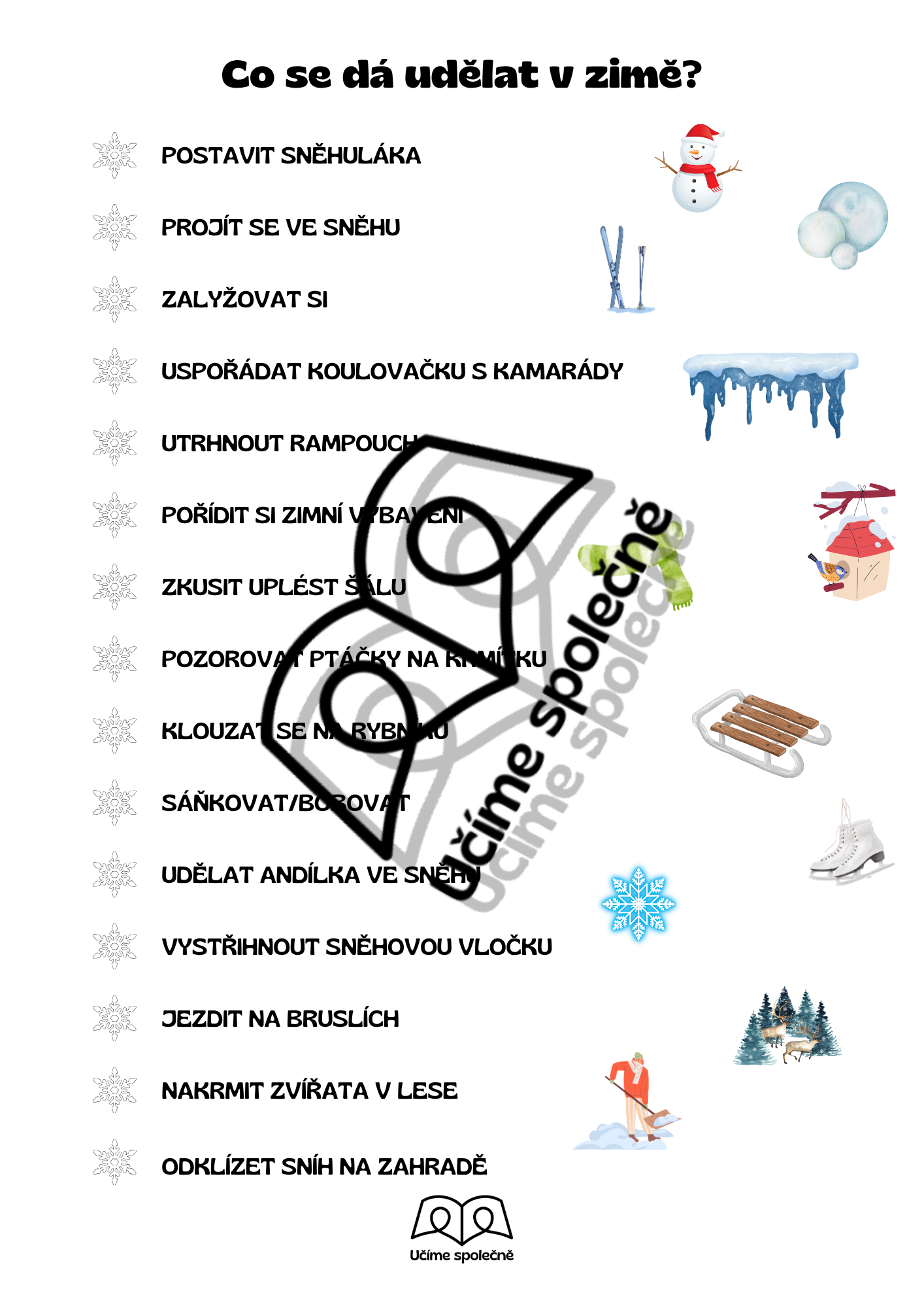 V tomto materiálu naleznete několik zimních aktivit vhodných pro práci ve vyučování, především v předmětech Prvouka/Člověk a jeho svět, Český jazyk.
