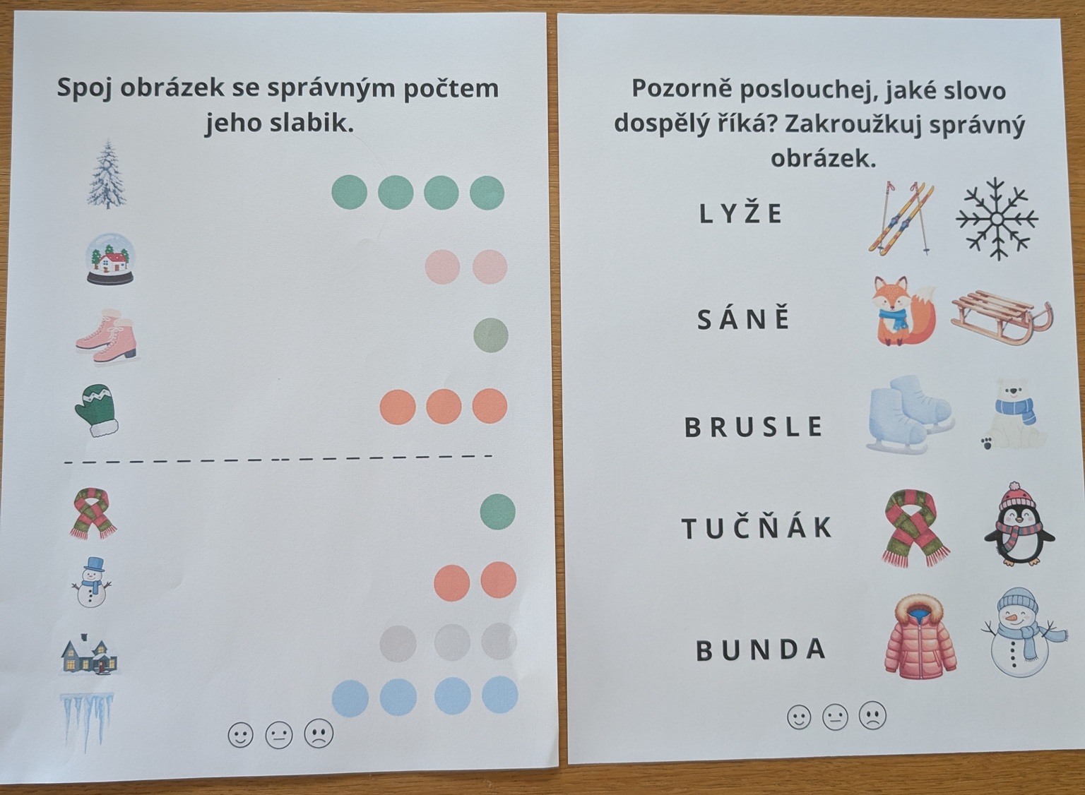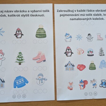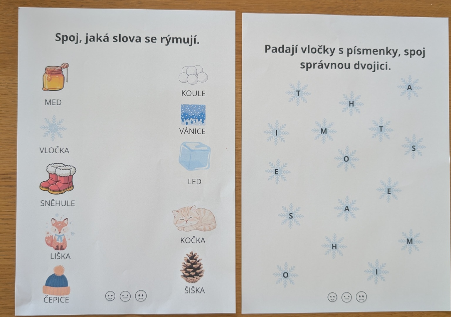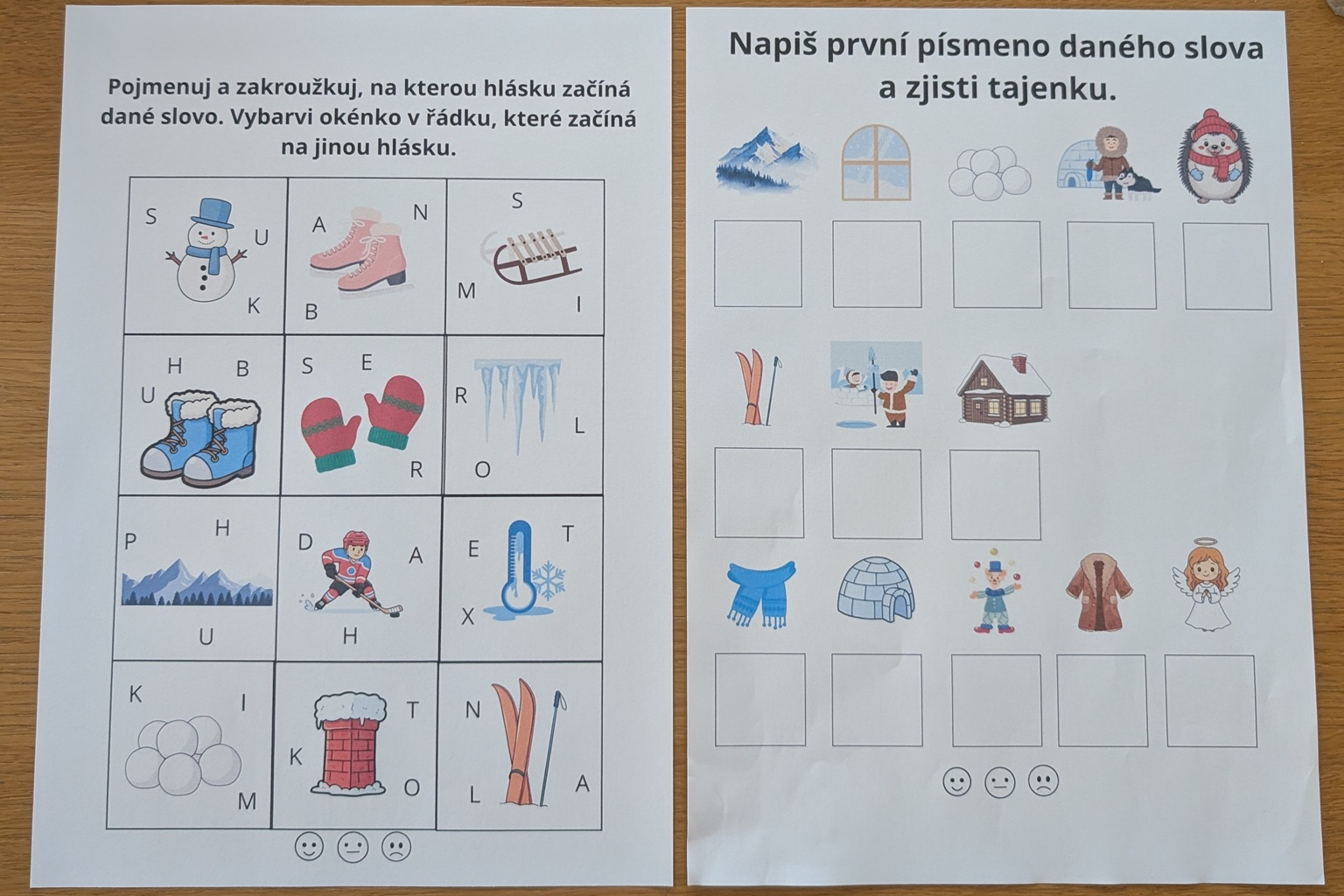 Jedná se o soubor 10 pracovních listů na hraní s písmeny a slovy se zimní tematikou. Najdete tu pracovní listy na slabiky, určování první hlásky ve slově, hláskování, rýmy a hledání stejných písmen.