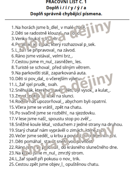 - Pravopisné doplňovačky: Procvičování i/í/y/ý po obojetných souhláskách a v koncovkách podstatných a přídavných jmen.