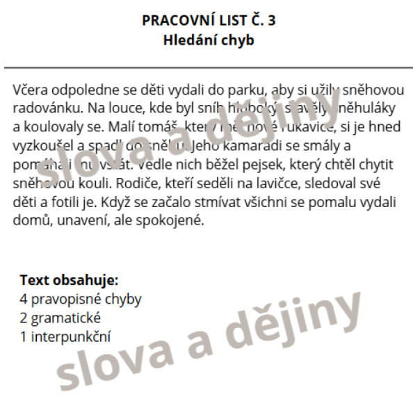 - Korektura textu: Hledání a oprava 7 chyb (pravopisných, gramatických a interpunkčních).