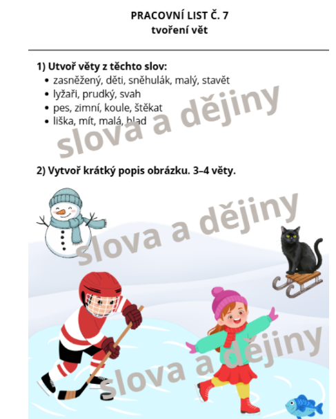 - Porozumění textu: Práce se zimním příběhem – úkoly typu Ano/Ne a vyhledávání konkrétních výrazů v textu.