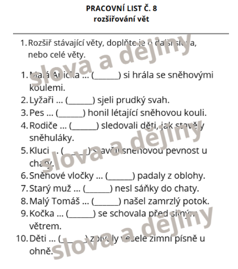 - Rozšiřování vět: Cvičení na rozvoj slovní zásoby a větnou stavbu pomocí doplňování informací do holých vět.