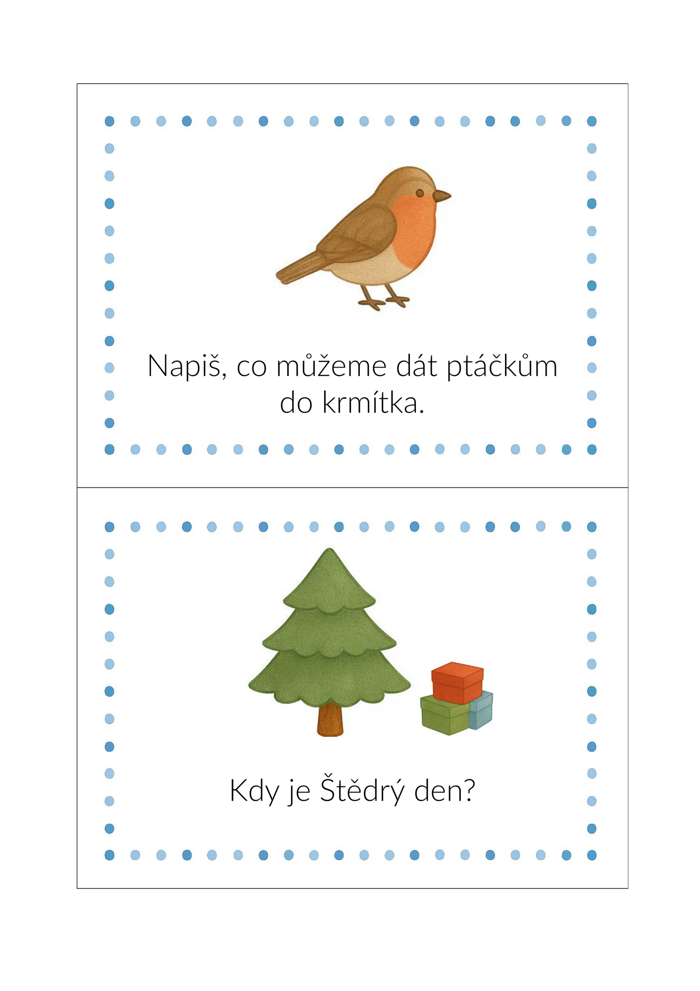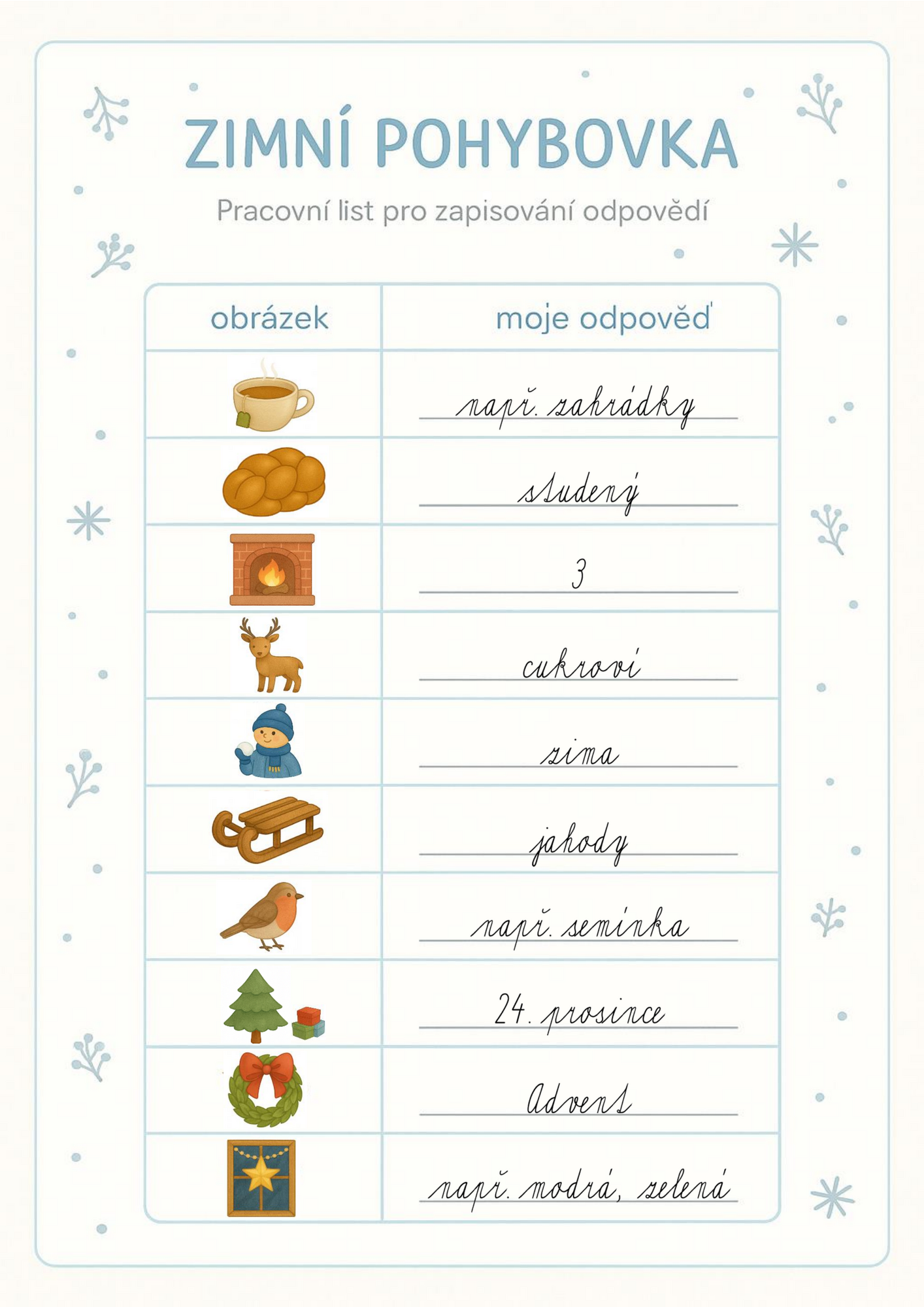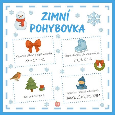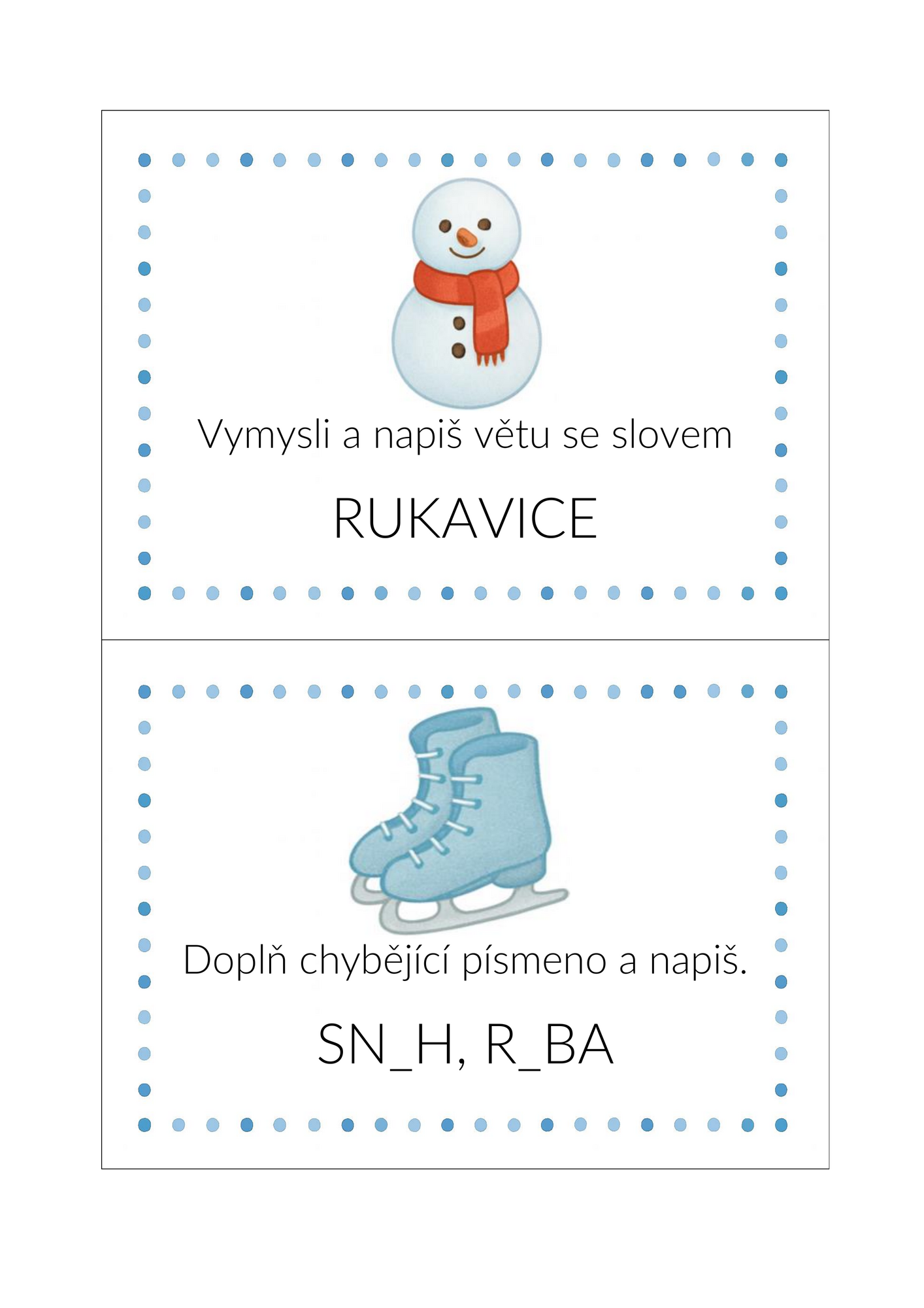 Tato zimní pomůcka byla vytvořena pro děti, které rády pracují v pohybu, objevují, zapisují a zároveň potřebují i prostor pro vlastní tempo. Soubor obsahuje 20 kartiček