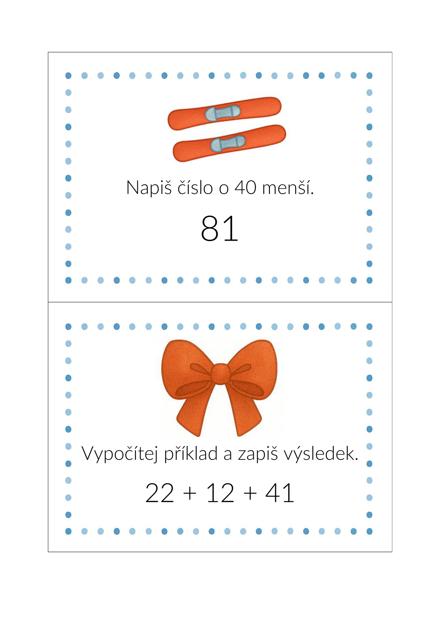 s obrázkem a krátkým úkolem a také zápisový list, kam si děti zaznamenávají své odpovědi. Součástí je i kontrolka.