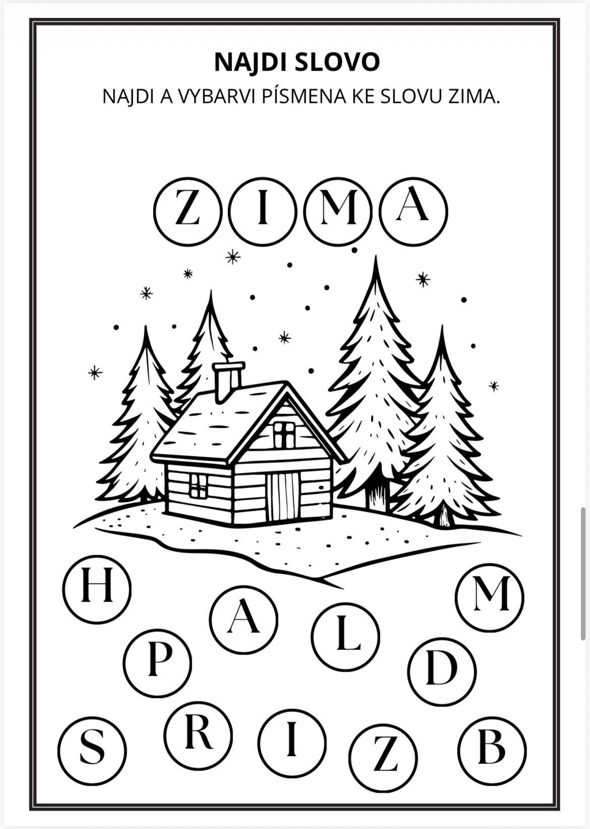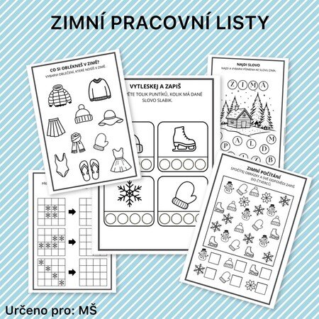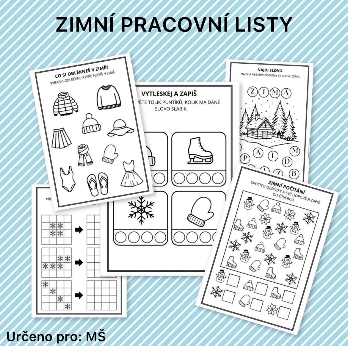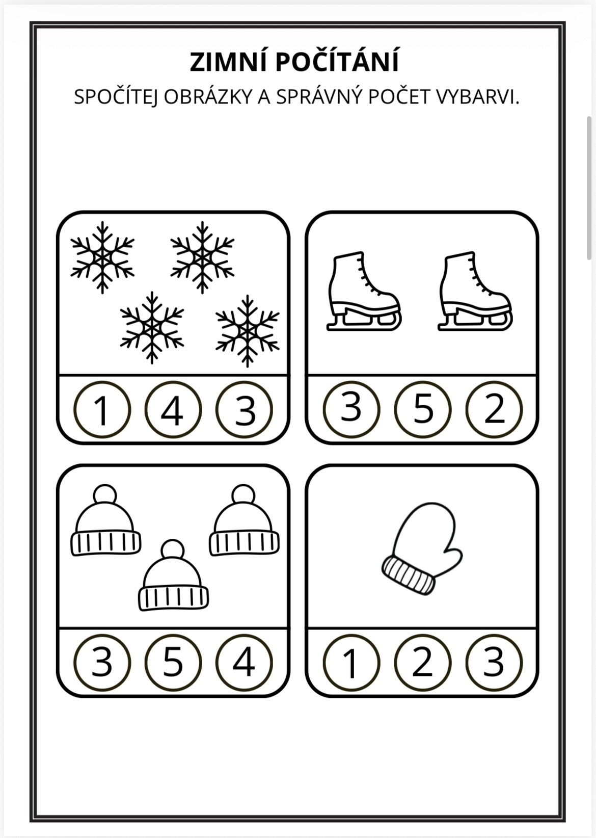 Materiál obsahuje úvodní stránku, průvodní list a 10 pracovním listů k zimnímu tématu. Děti si procvičí matematickou i čtenářskou gramotnost, zrakovou diferenciaci a jemnou motoriku.