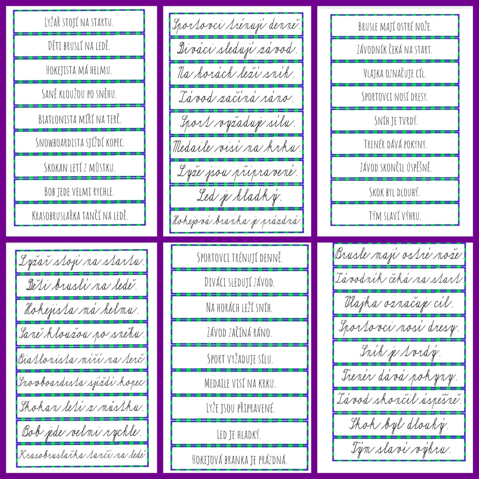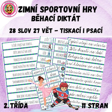 Běhací diktát na téma zimní sportovní hry je určen pro žáky 2. třídy základní školy a obsahuje celkem 28 slov a 27 krátkých vět. Aktivita je zaměřena na procvičení správného přepisu slov a jednoduchých vět, rozvoj sluchové a zrakové paměti a zároveň podporuje přirozený pohyb žáků během vyučování. Tematicky vychází ze zimních sportů, které jsou dětem blízké a dobře srozumitelné.
