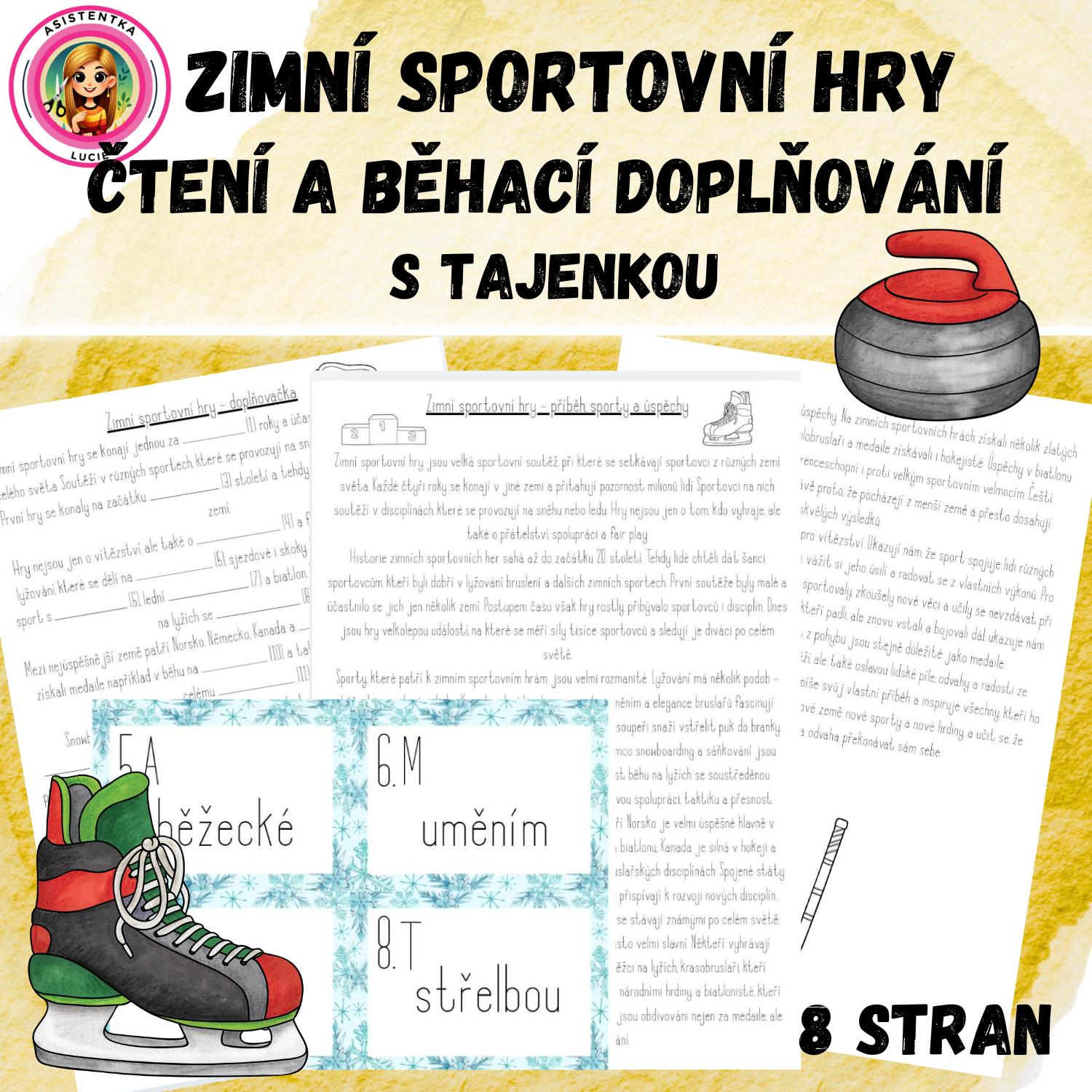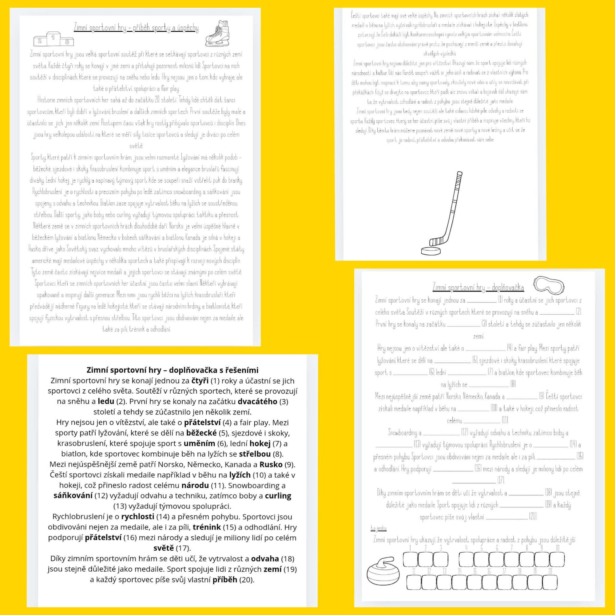 Žáci nejprve pracují s dlouhým souvislým textem o zimních sportovních hrách. Text seznamuje děti s historií her, zimními sporty, úspěšnými zeměmi, sportovci a hodnotami sportu. Slouží jako zdroj informací, ke kterému se mohou v průběhu práce vracet.
