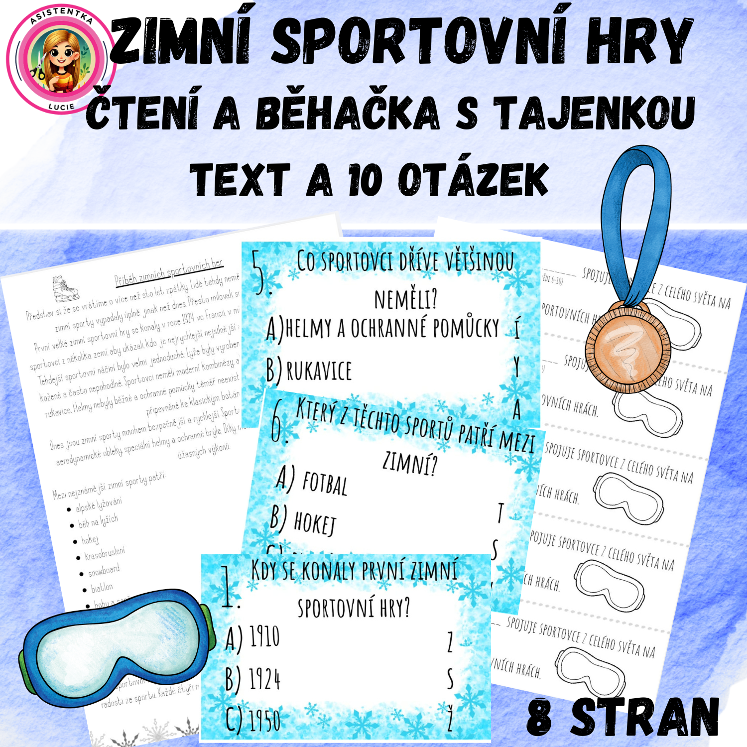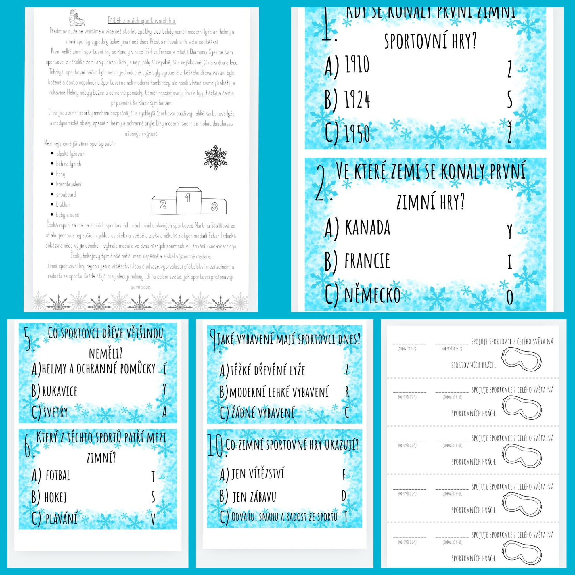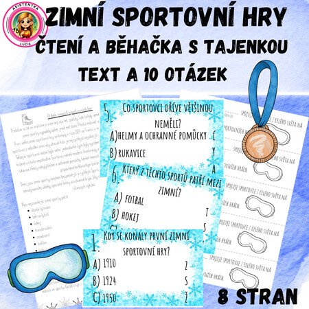 Tento materiál je určen pro žáky 1. stupně a zaměřuje se na téma zimních sportů a sportovních her. Cílem je seznámit děti s historií zimních sportovních her, s nejznámějšími sporty a významnými českými sportovci, a zároveň procvičit čtení s porozuměním. Materiál obsahuje krátký text, který lze číst s žáky nahlas nebo nechat děti číst samostatně, a dále deset otázek s možnostmi ABC, přičemž vždy pouze jedna odpověď je správná. Každá správná odpověď je zároveň písmenem tajenky, která se skládá do slova „ZIMNÍ SPORT“.