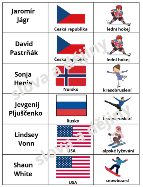 - Úkol: Přiřadit typické zimní sporty pro určité země.