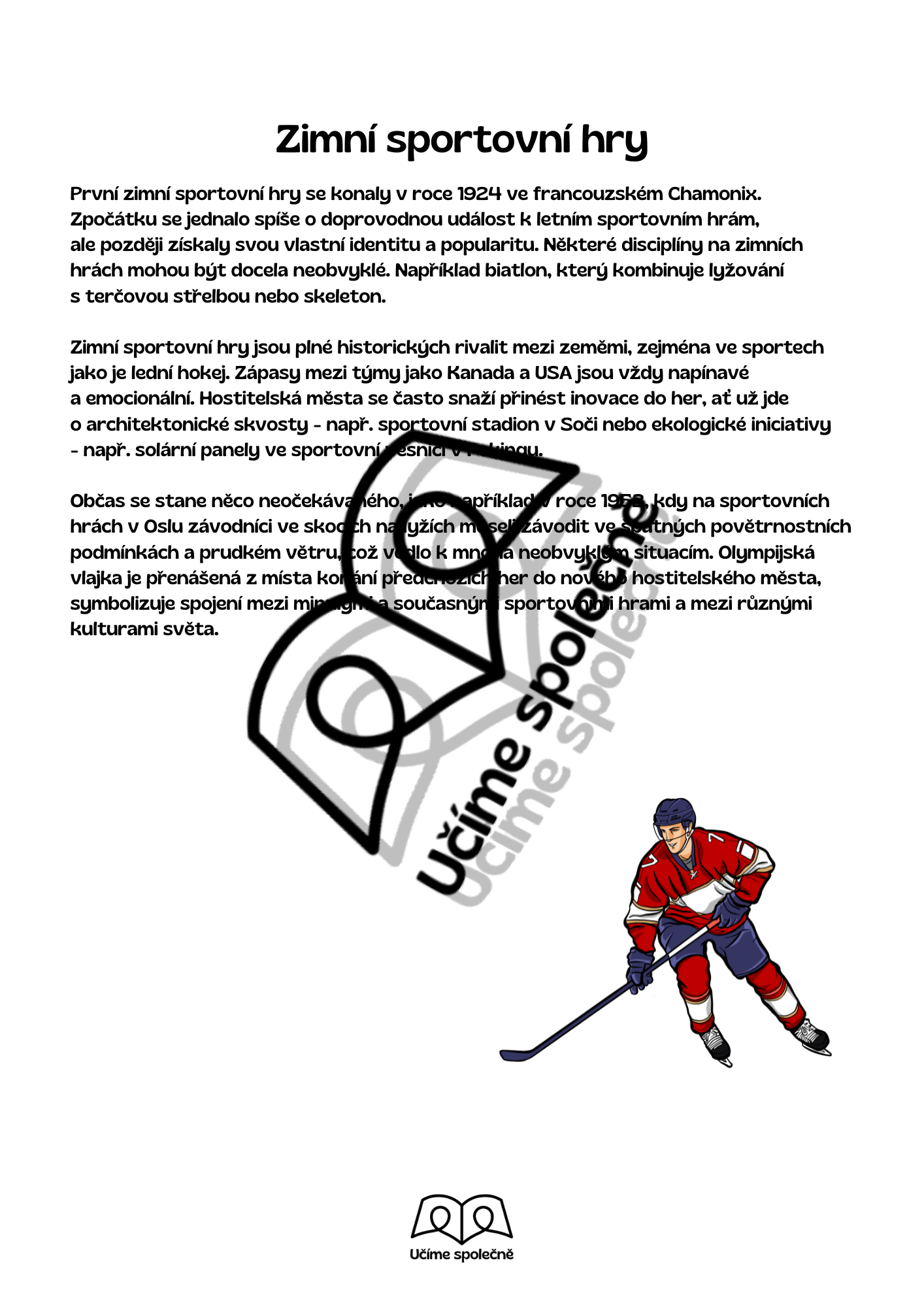 Materiál je zaměřen na téma zimní sporty a je určen pro žáky čtvrtých a pátých tříd základní školy. Žáci si zde procvičí práci s textem a QR cody.