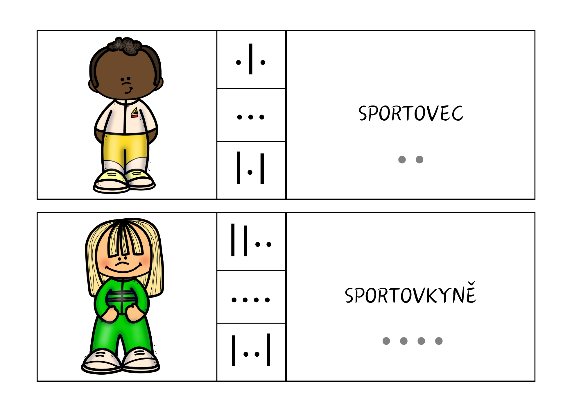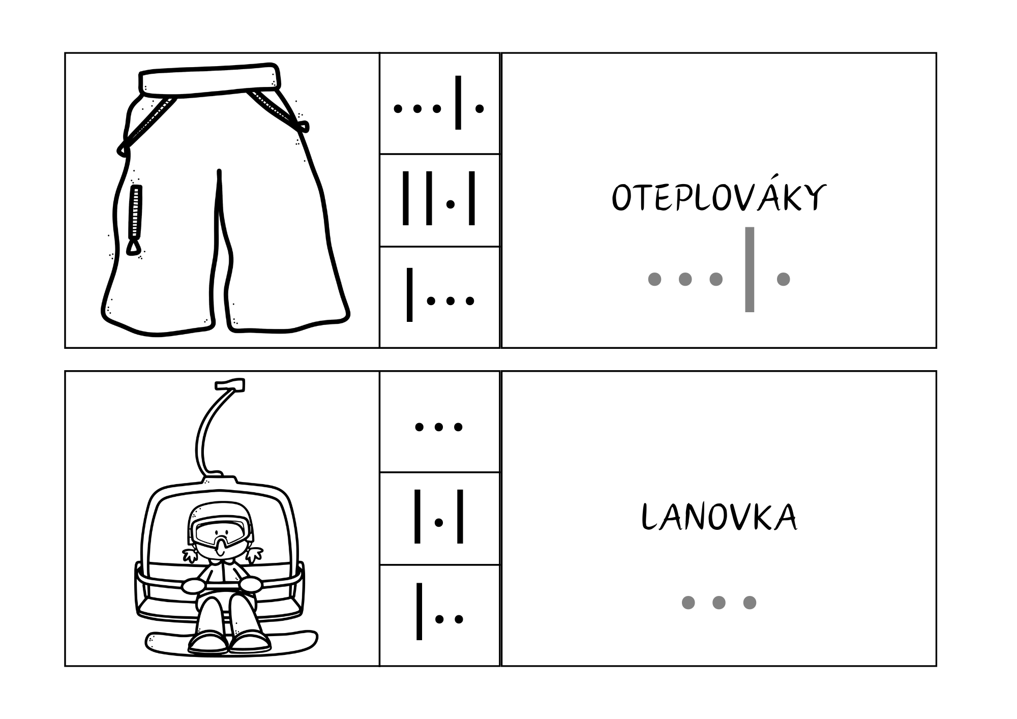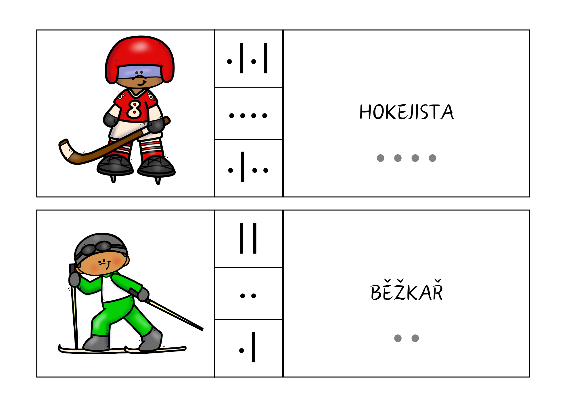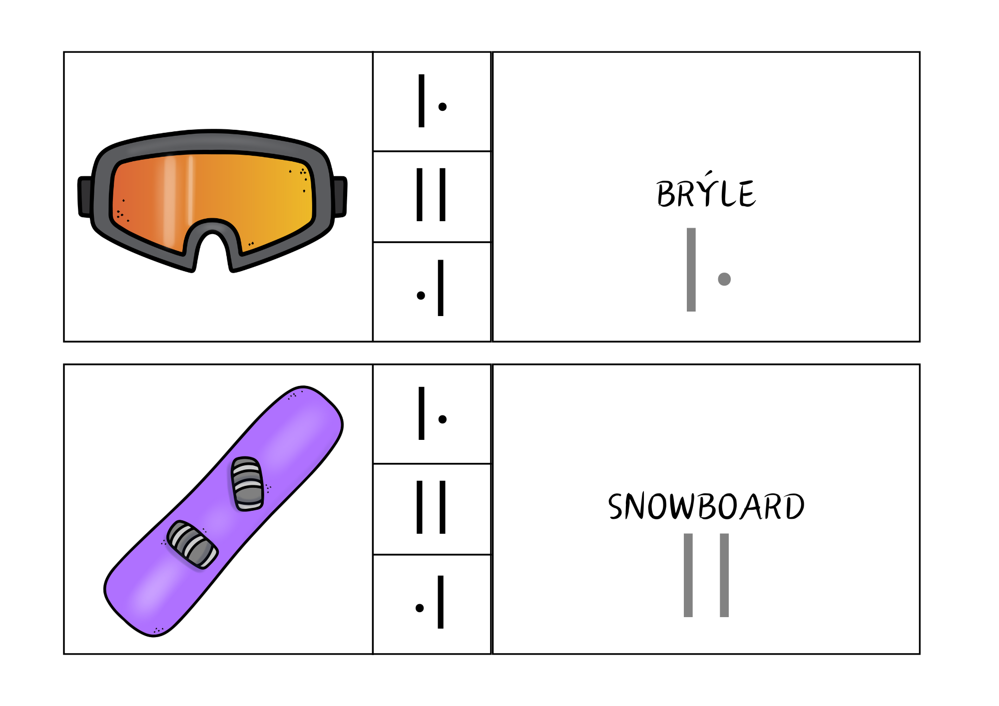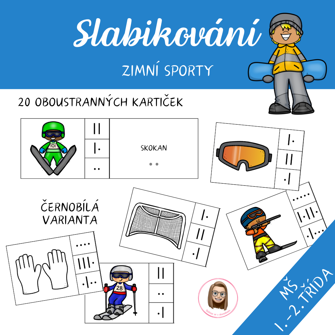 Soubor je zaměřen na rozvoj fonematického sluchu prostřednictvím slabikování slov s tematikou zimních sportů. Děti rozkládají slova na slabiky a zaznamenávají jejich délku pomocí symbolů.