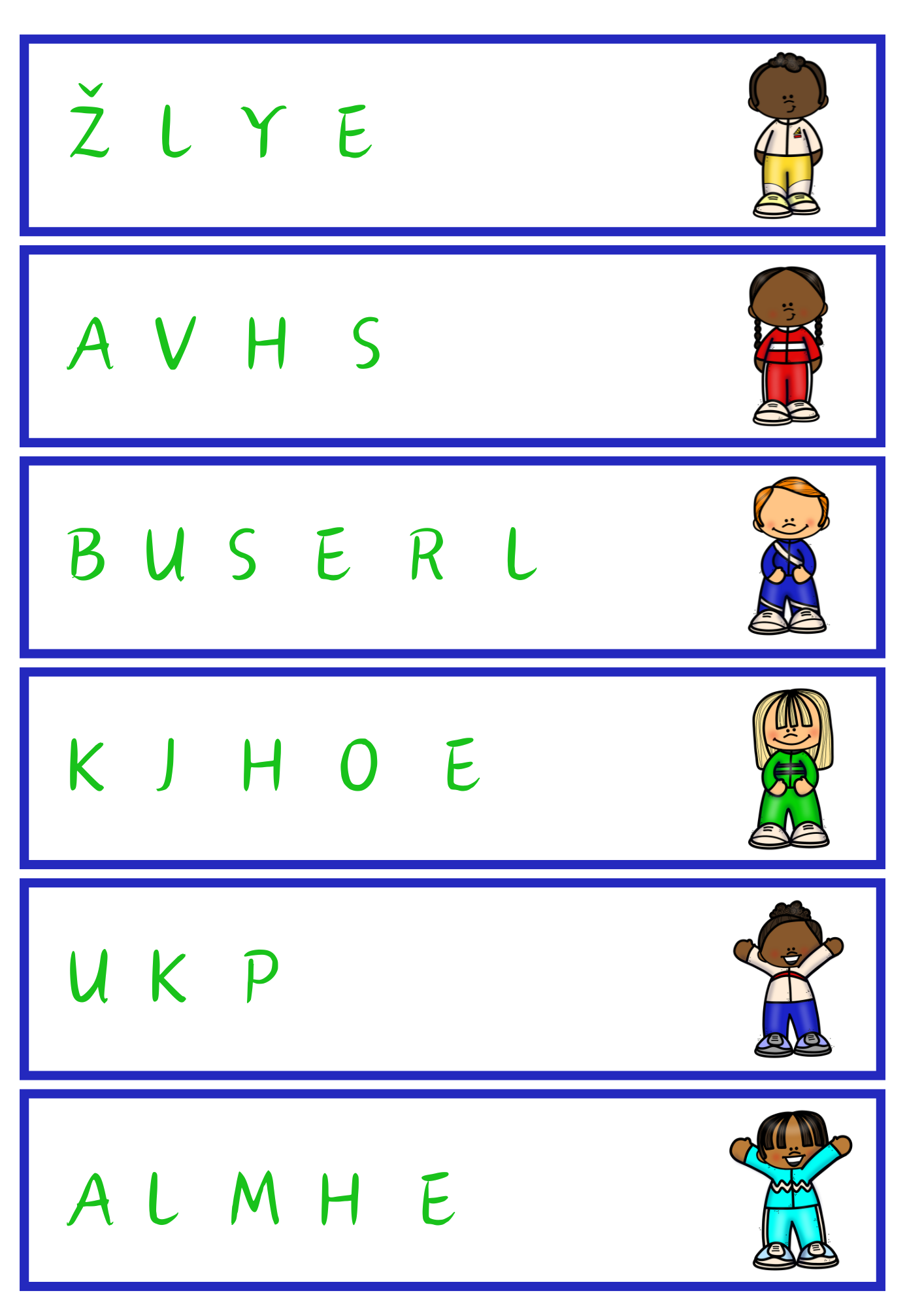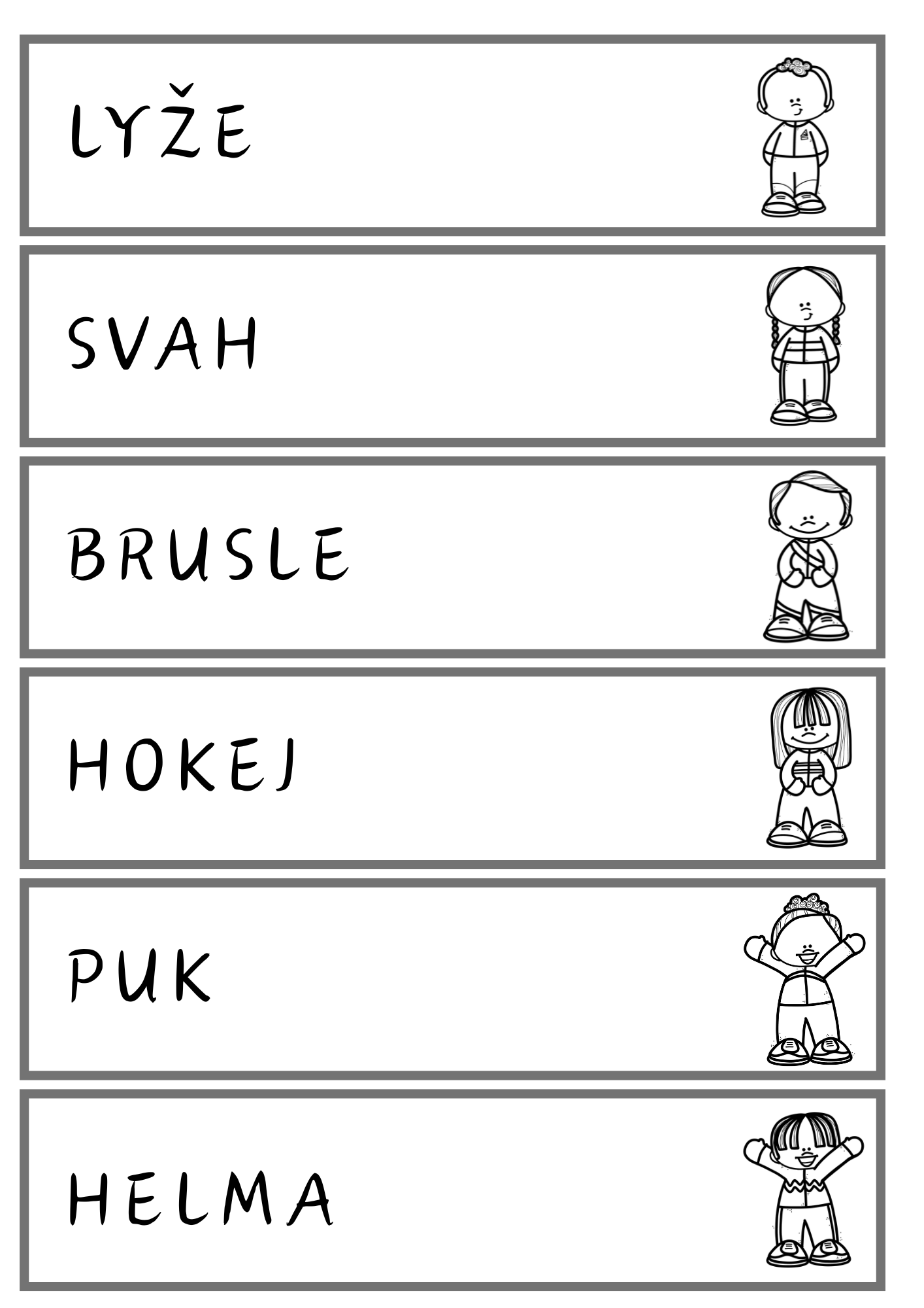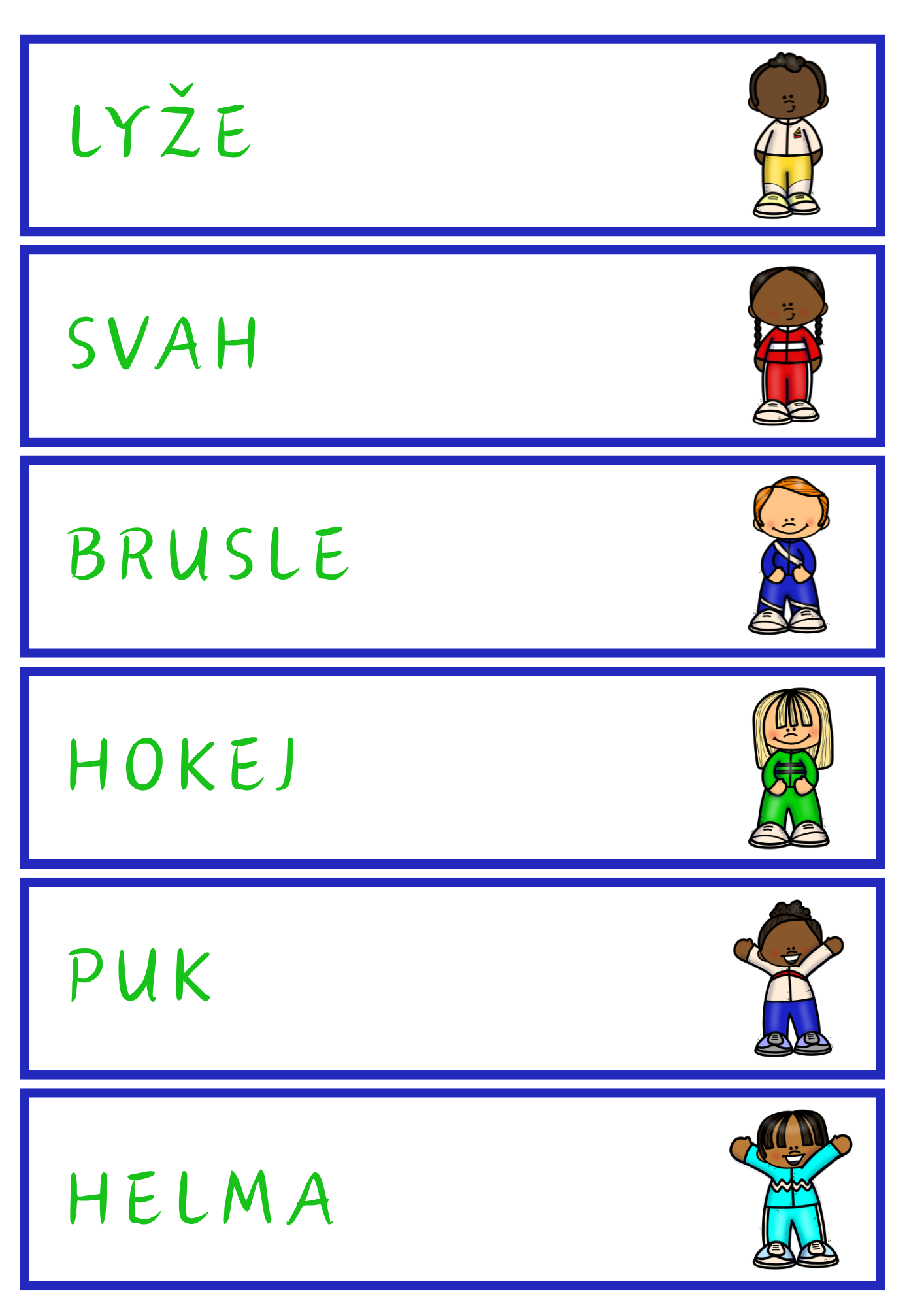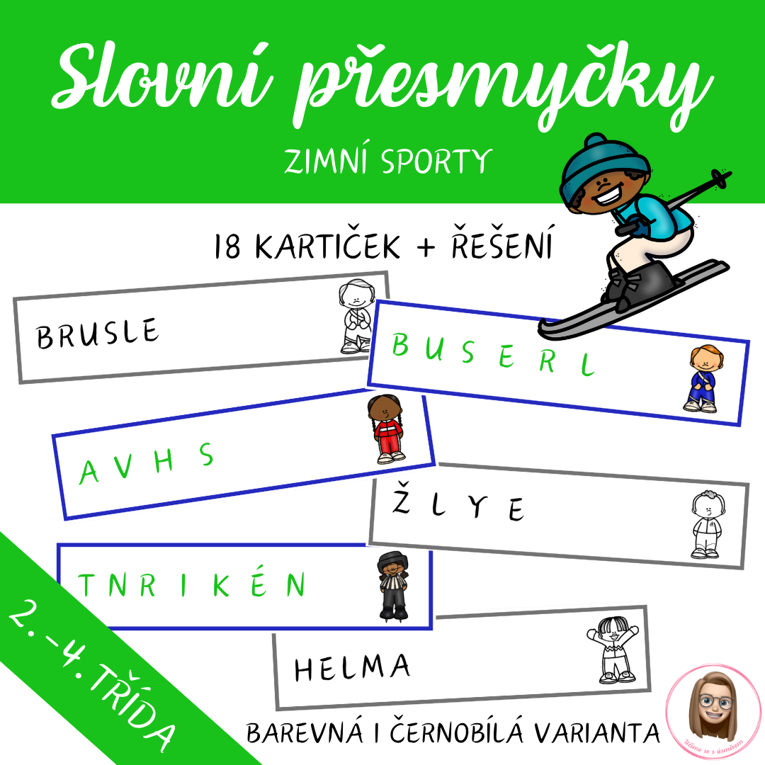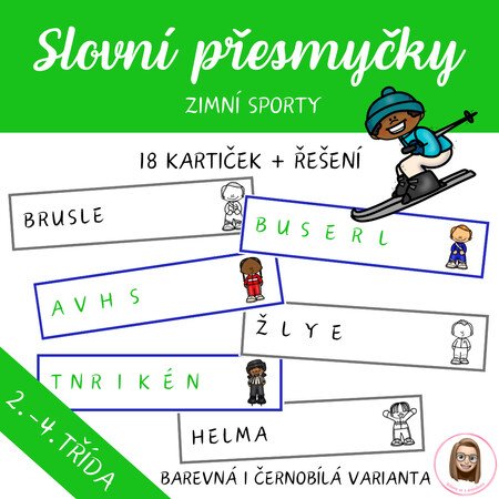Soubor obsahuje 18 kartiček se slovními přesmyčkami na téma zimní sporty a 18 kartiček s řešeními. Děti hravou formou procvičují práci se slovy, čtení a slovní zásobu.