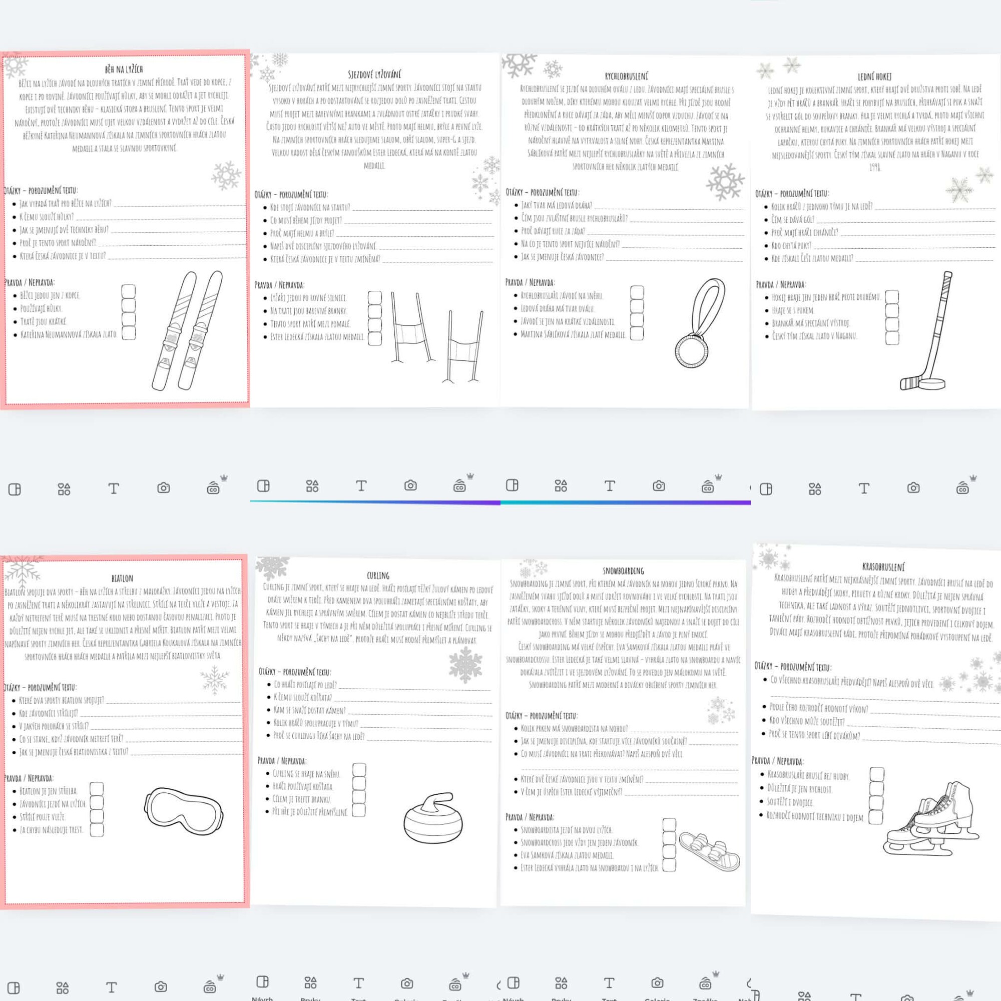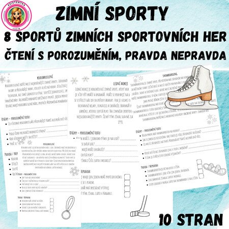 Materiál je zaměřen na práci s textem s tematikou zimních sportů. Žáci se postupně seznamují s jednotlivými sporty, mezi které patří sjezdové lyžování, běh na lyžích, lední hokej, rychlobruslení, krasobruslení, snowboarding, biatlon a curling. Každý sport má vlastní text, na který navazují otázky k porozumění a úkol Pravda / Nepravda. Texty jsou psány tak, aby odpovídaly čtenářským dovednostem žáků na prvním stupni a zároveň obsahovaly zajímavé informace o sportovcích a průběhu závodů.