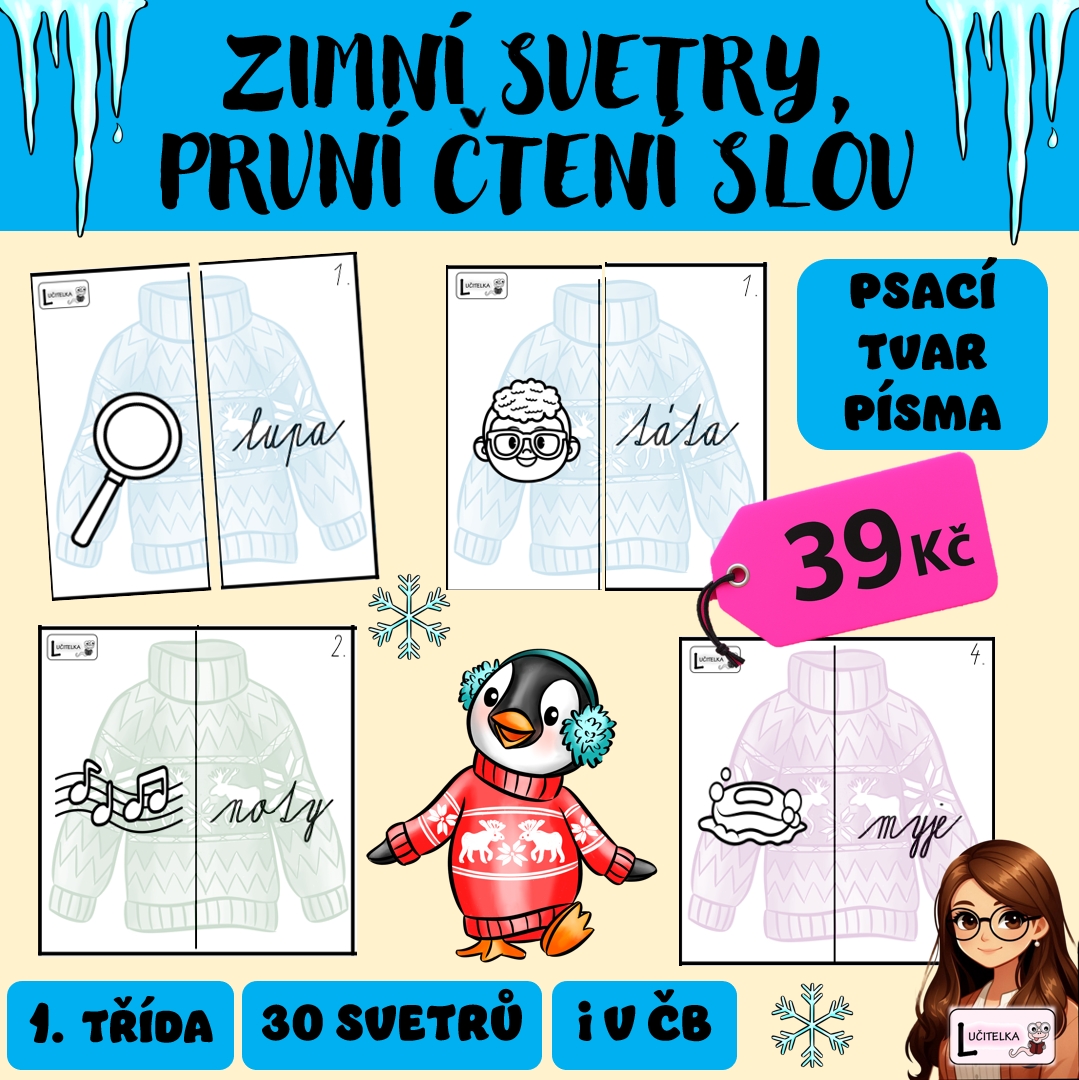 Cílem materiálu je procvičit si první čtení slov s porozuměním. Jedná se o soubor 30 svetrů, kde každý svetr se skládá ze slova a obrázku. Žáci mají za úkol slova přečíst a k slovu vždy najít správný obrázek. Slova jsou psána pouze psacím tvarem písma. Hrajeme ve skupinách dle barevného rozlišení. Rozsah písmen odpovídá cca do prosince 1. třídy – M, L, S, P, T, J, N, Y a samohlásky. V materiálu najdete i černobílou variantu, kterou lze využít i jako omalovánku. Rychlíci mohou slova opisovat či přepisovat do sešitu nebo na mazací tabulku. Černobílou variantu lze vytisknout i na barevné papíry pro snazší rozřazení do skupin.