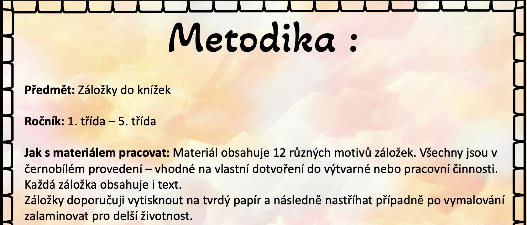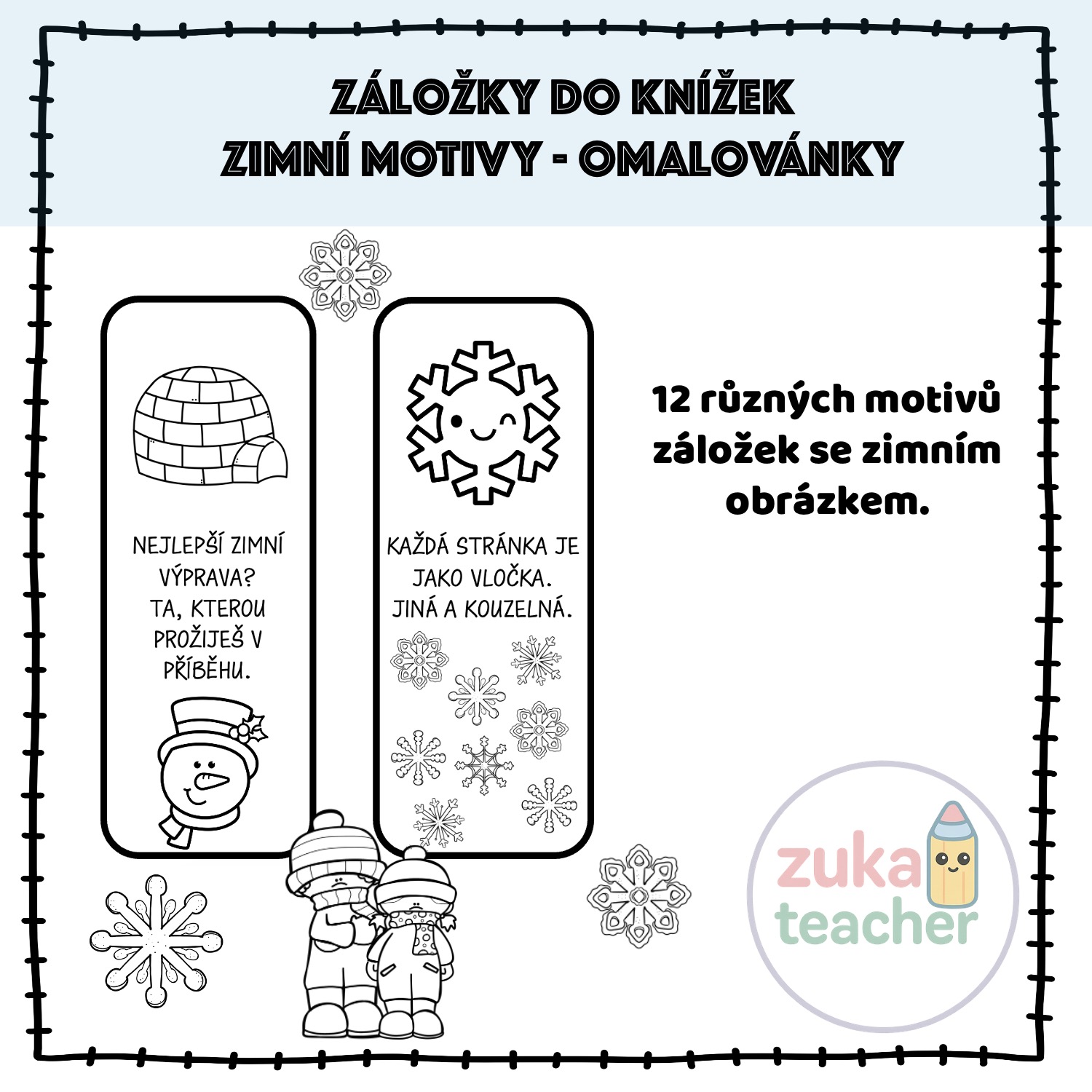 Materiál obsahuje 12 různých motivů záložek. Všechny jsou v černobílém provedení – vhodné na vlastní dotvoření do výtvarné nebo pracovní činnosti.