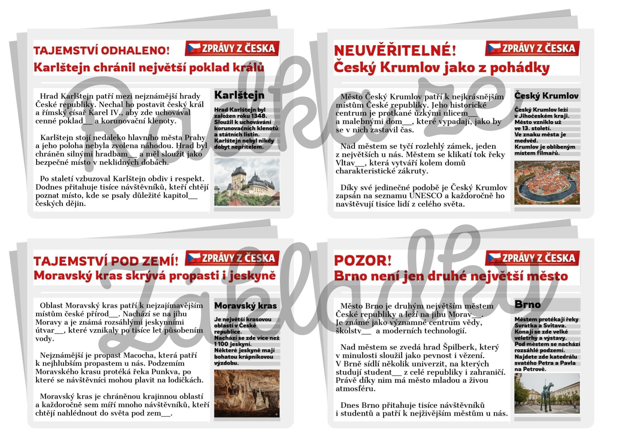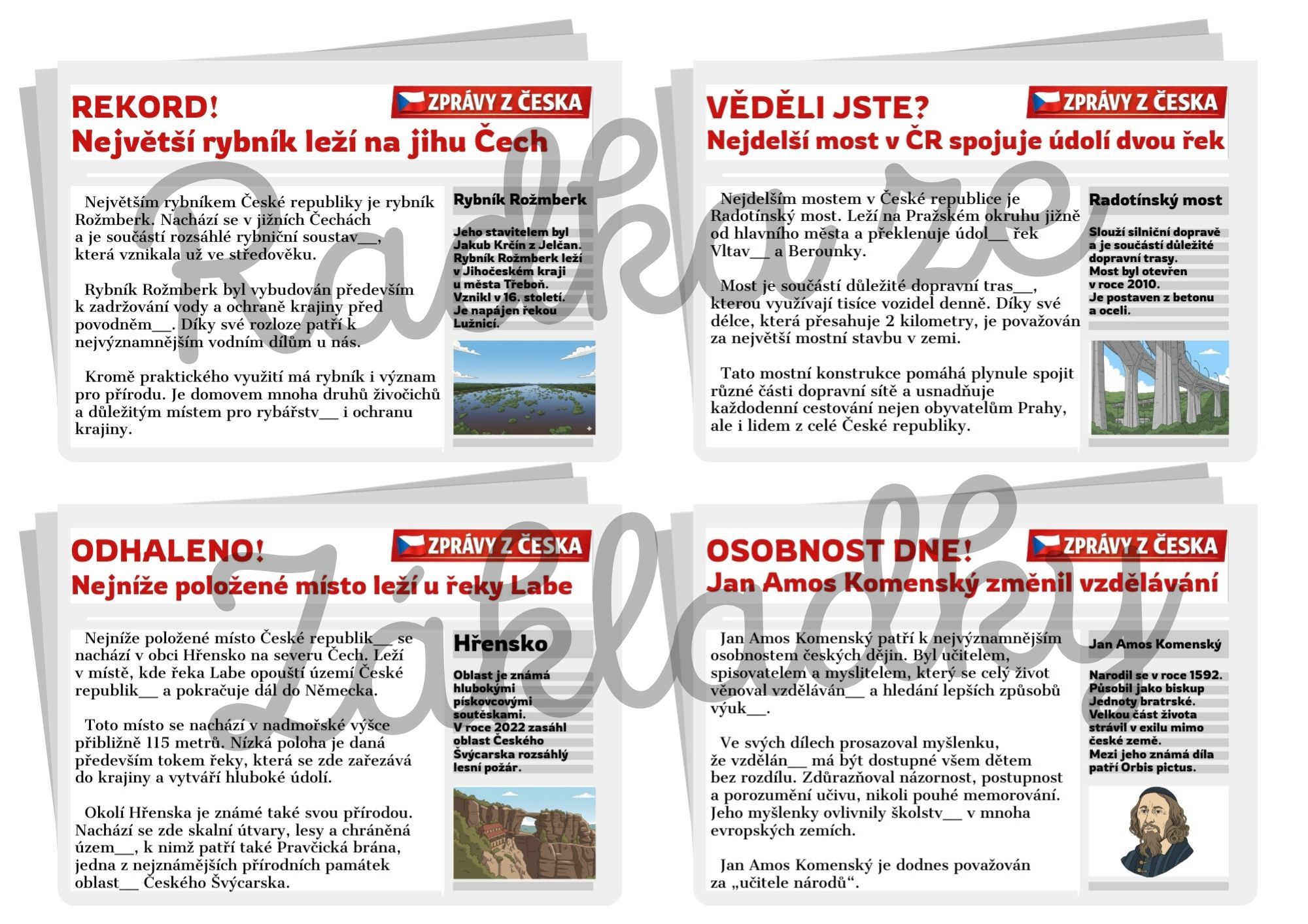 - 32 tematických kartiček ve stylu novinových zpráv