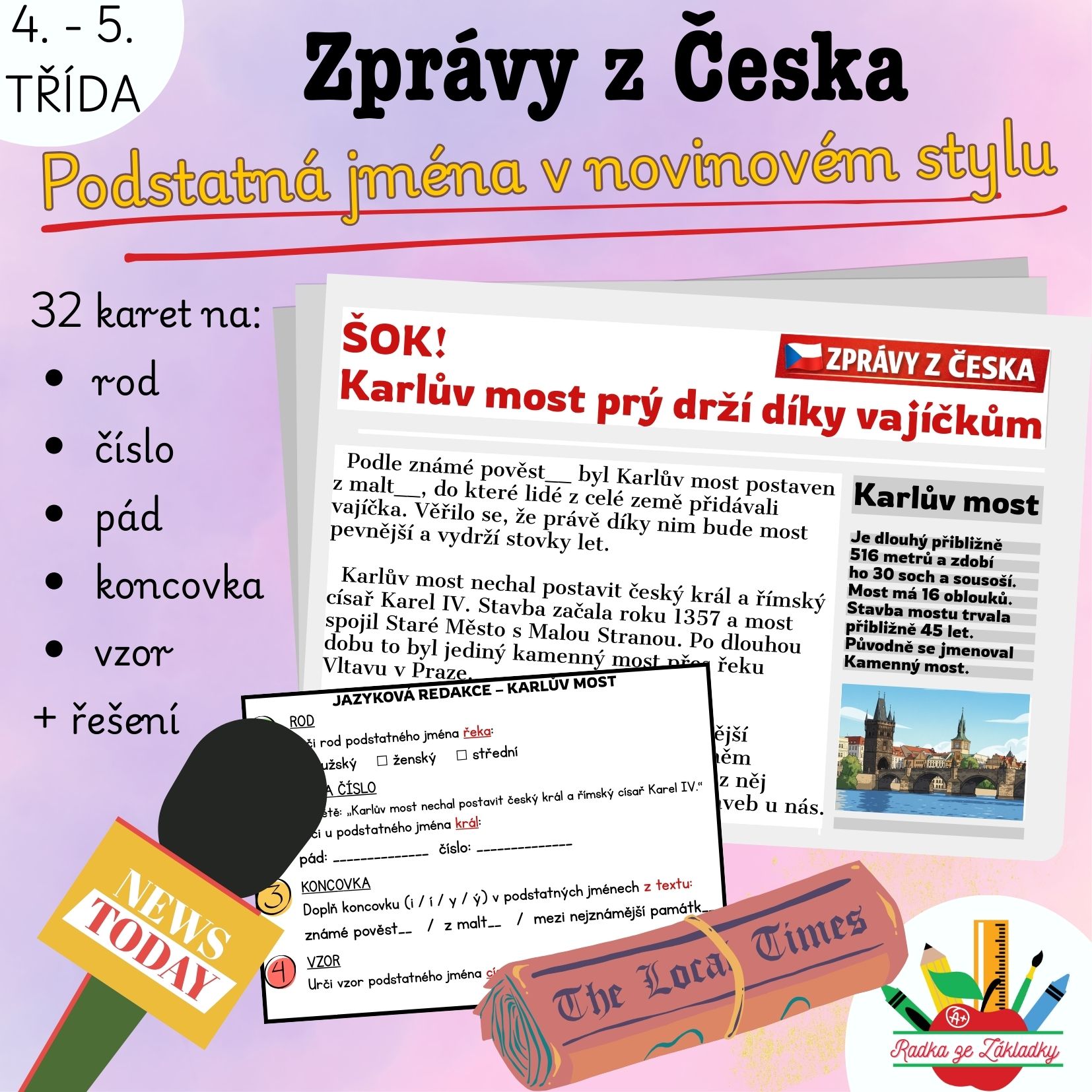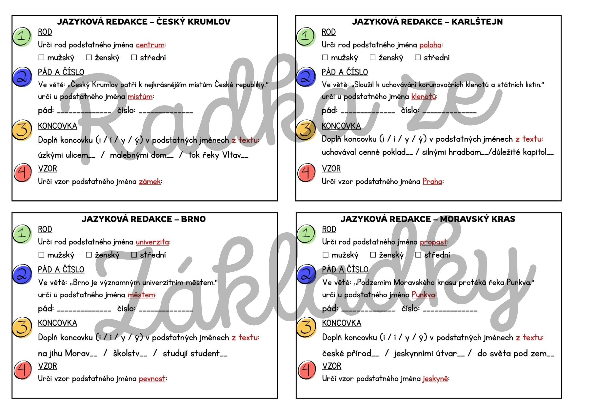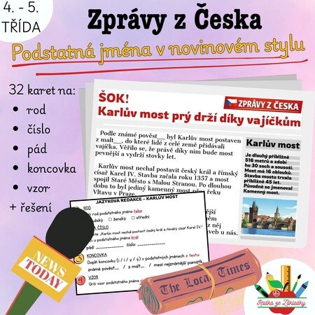 - 32 navazujících karet s úkoly (ke každé zprávě jedna karta s úkoly k podstatným jménům: rod, pád a číslo, koncovky i/í/y/ý, vzory) - tisk na druhou stranu