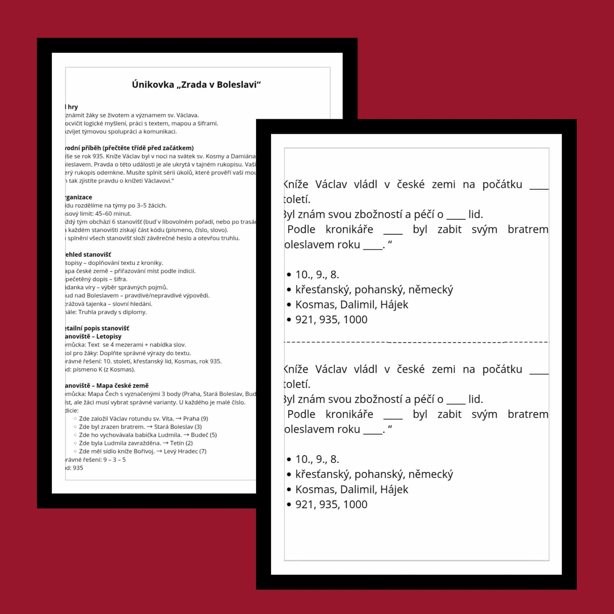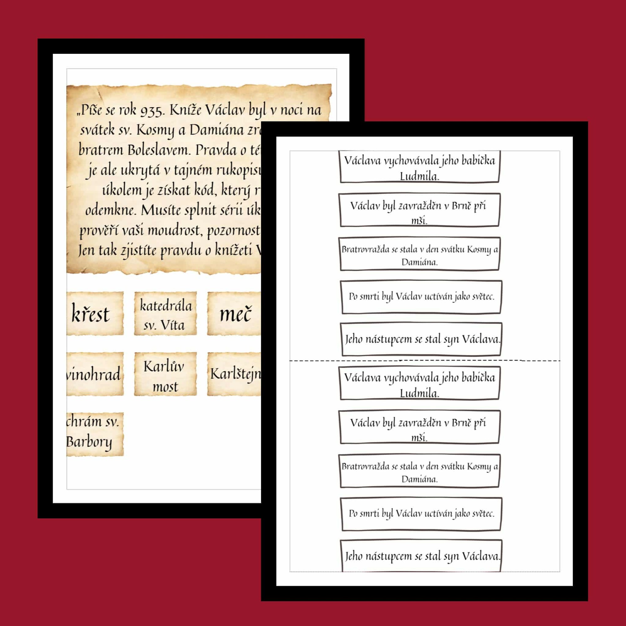 Únikovka začíná úvodním příběhem, který pedagog přečte třídě před začátkem hry: „Píše se rok 935. Kníže Václav byl v noci na svátek sv. Kosmy a Damiána zrazen svým bratrem Boleslavem. Pravda o této události je ale ukrytá v tajném rukopisu. Vaším úkolem je získat kód, který rukopis odemkne. Musíte splnit sérii úkolů, které prověří vaši moudrost, pozornost i znalosti. Jen tak zjistíte pravdu o knížeti Václavovi.“ Tento úvod motivuje žáky a nastavuje napětí potřebné pro hru.