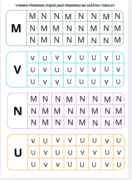 Tato pomůcka je určena k rozvoji zrakové percepce, pozornosti a schopnosti vizuální diferenciace jednotlivých písmen. Materiál obsahuje čtyři tabulky s písmeny, z nichž každá je uvedena velkým vzorovým písmenem (K, D, L, R, V, U, M, M, P, D, B). Úkolem žáků je mezi různými písmeny vyhledávat a označovat pouze ta písmena, která odpovídají písmenu uvedenému na začátku jednotlivých tabulek.