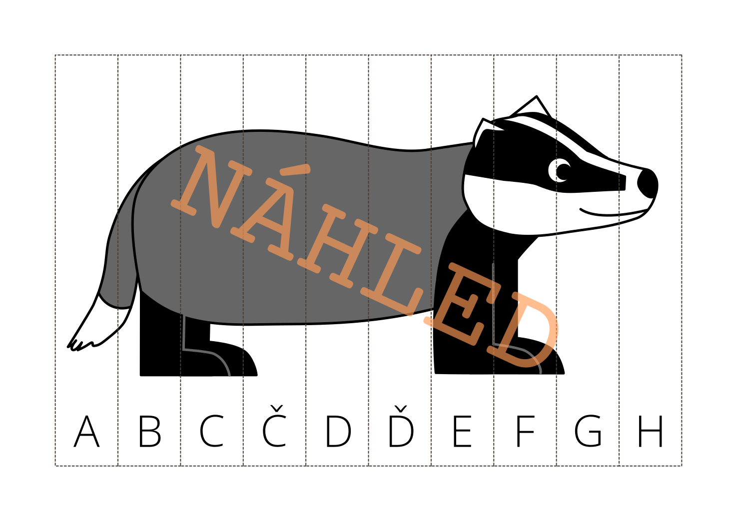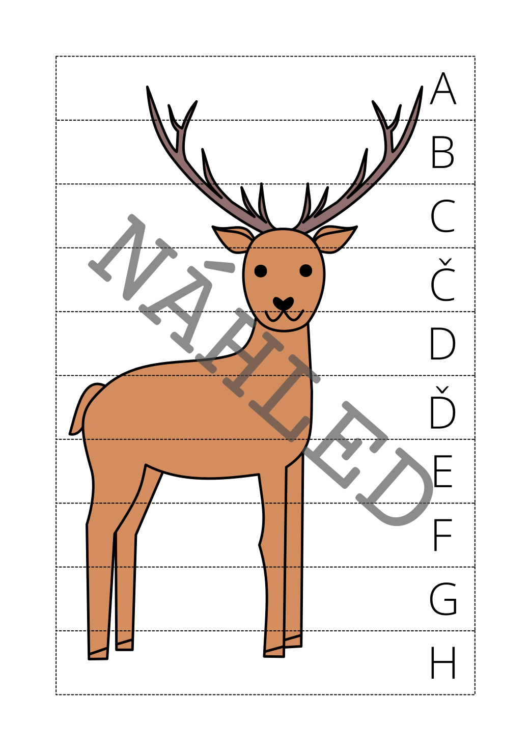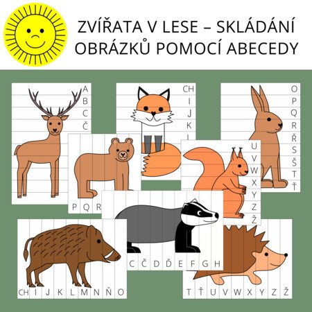 Materiál obsahuje skládačky osmi zvířat žijících v lese (jelen, liška, zajíc, veverka, jezevec, divočák, medvěd, ježek).
