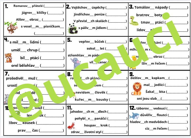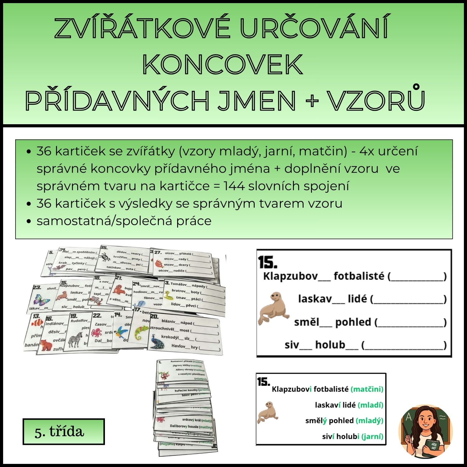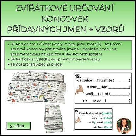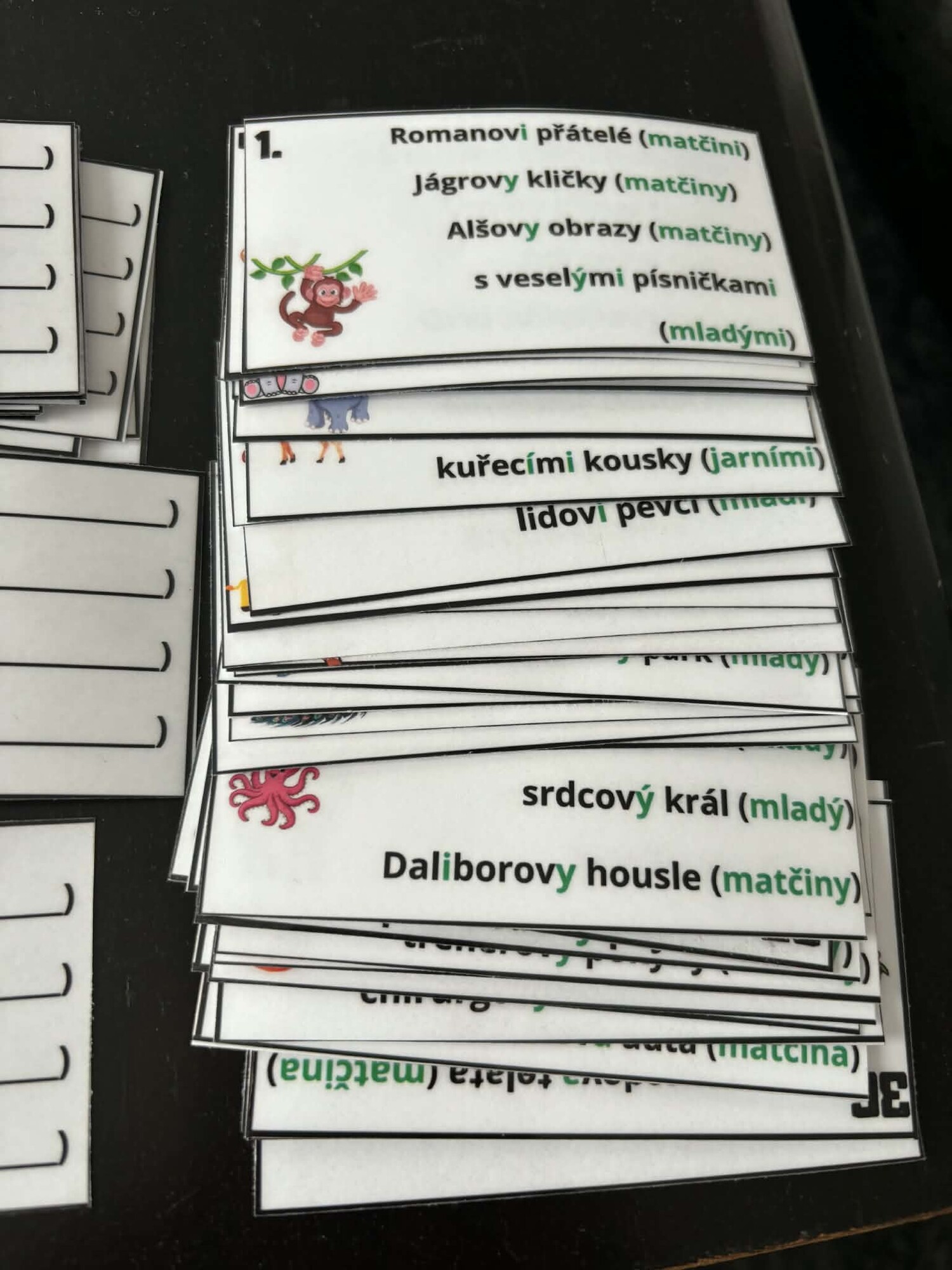 - 36 kartiček na určení koncovek přídavných jmen (mladý, jarní, matčin) - každá kartička 4 slovní spojení