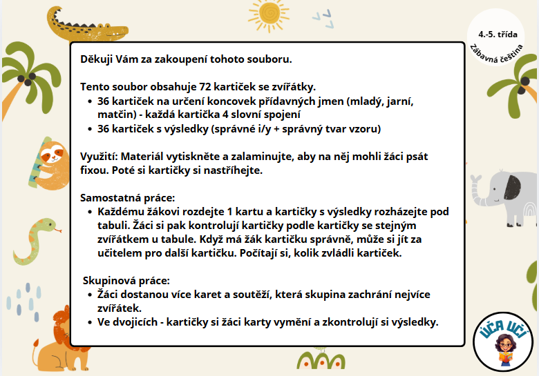 - Každému žákovi rozdejte 1 kartu a kartičky s výsledky rozházejte pod tabuli. Žáci si pak kontrolují kartičky podle kartičky se stejným zvířátkem u tabule. Když má žák kartičku správně, může si jít za učitelem pro další kartičku. Počítají si, kolik zvládli kartiček.