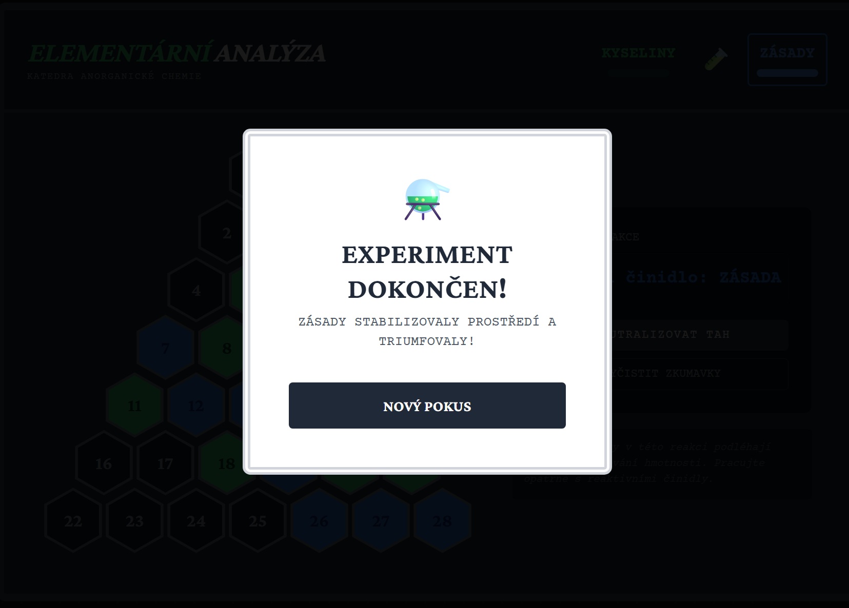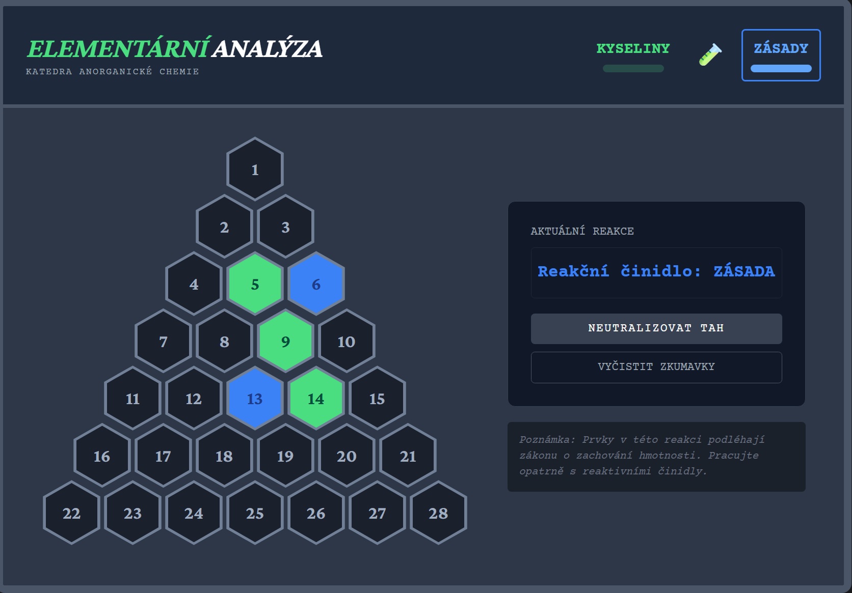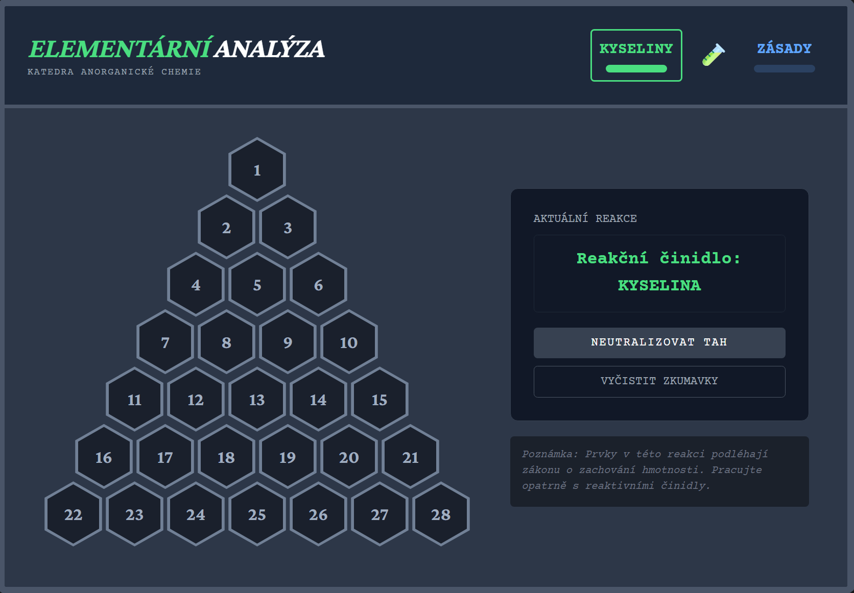 - Herní princip: Dva týmy (Kyseliny vs. Zásady) soupeří o ovládnutí hracího pole ve tvaru pyramidy složené z 28 šestiúhelníků.