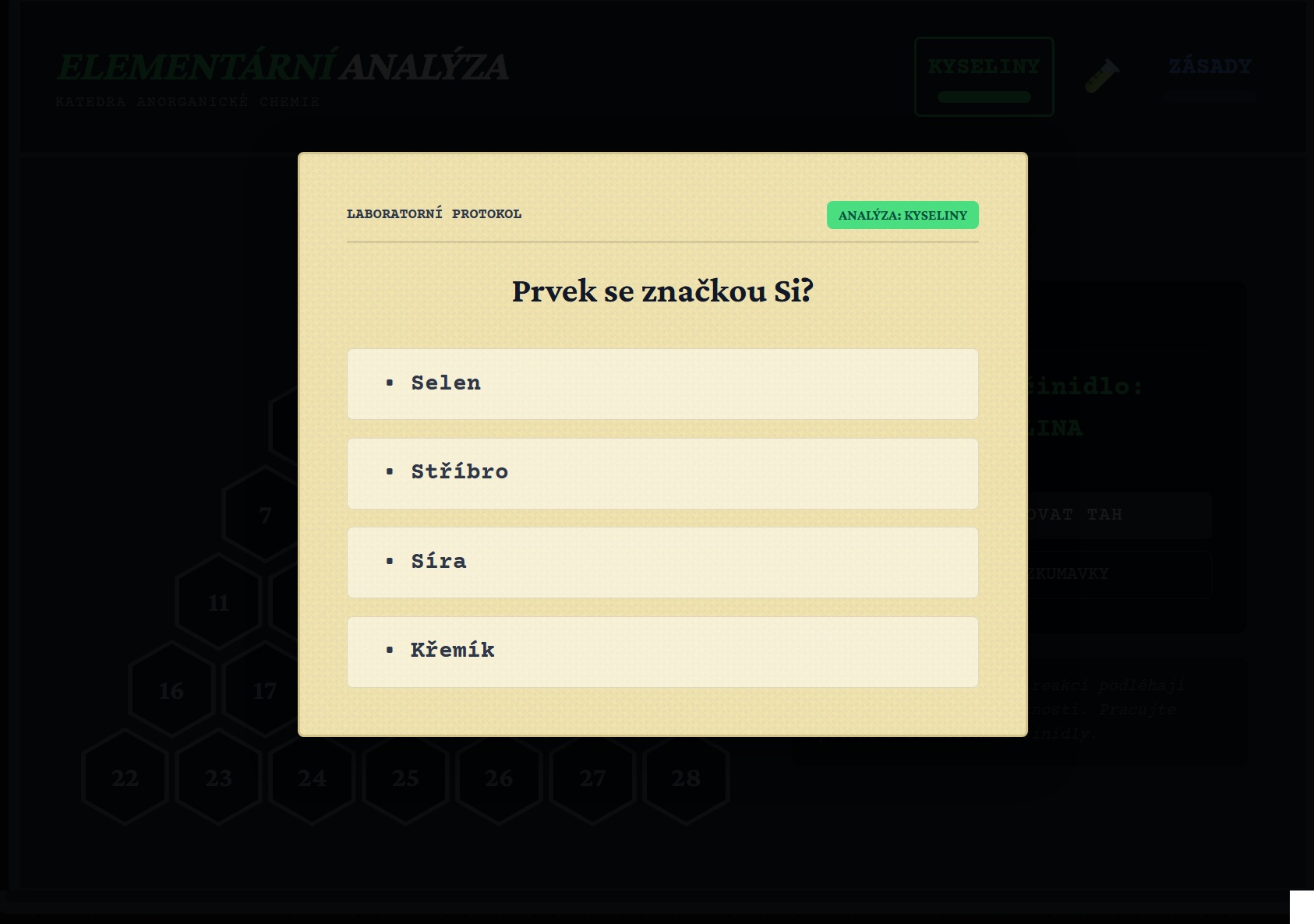 Tato aktivita je interaktivní vzdělávací hra inspirovaná populárním televizním pořadem AZ-Kvíz, kompletně přepracovaná do tématu chemické laboratoře.